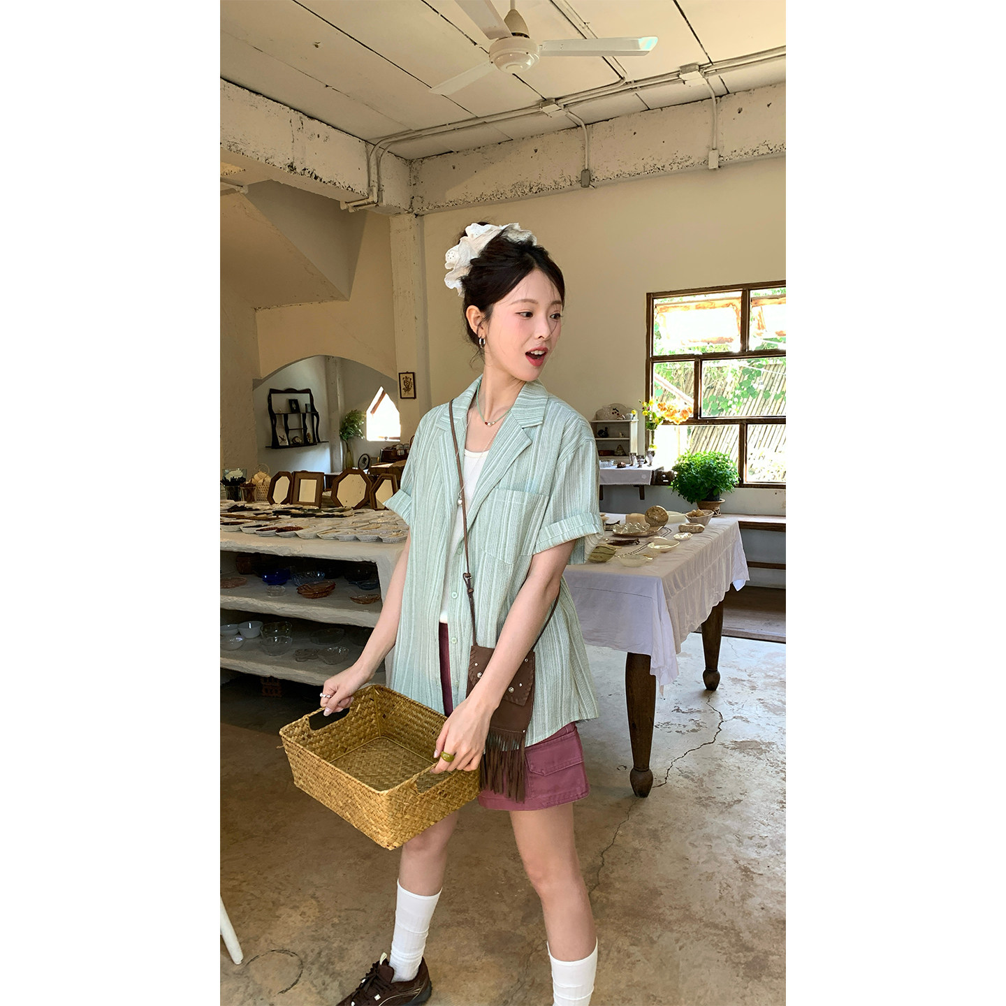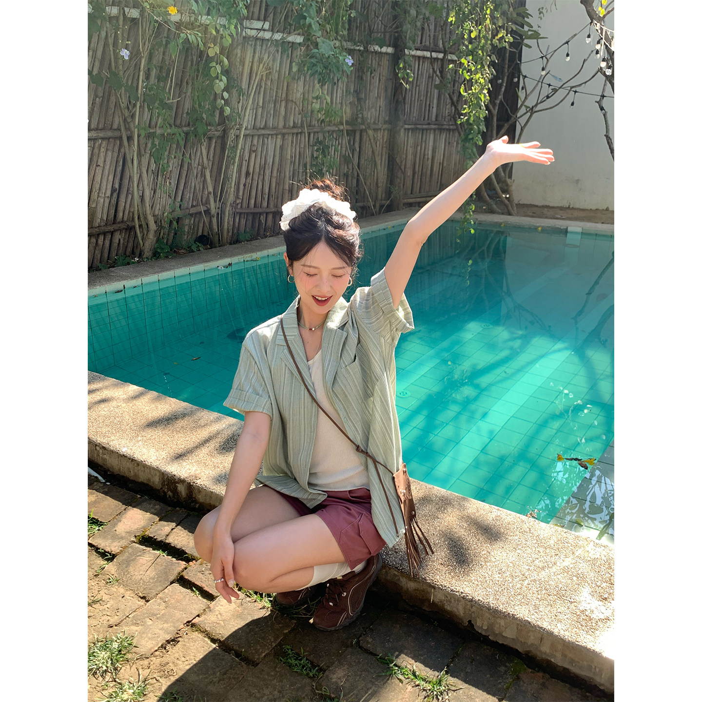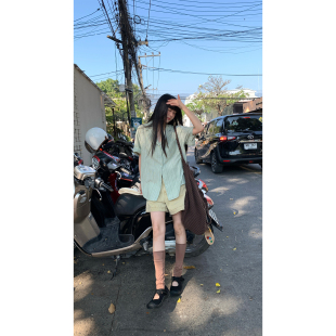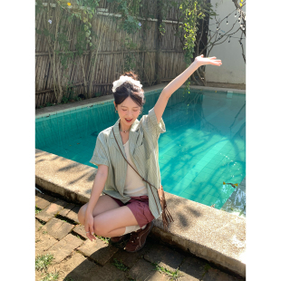 宽松西装 CCKOK 2026春夏新款 衬衫 领衬衣外套女 日系竖条纹休闲短袖