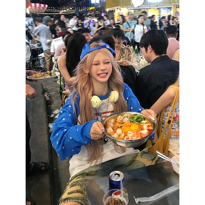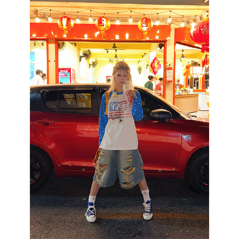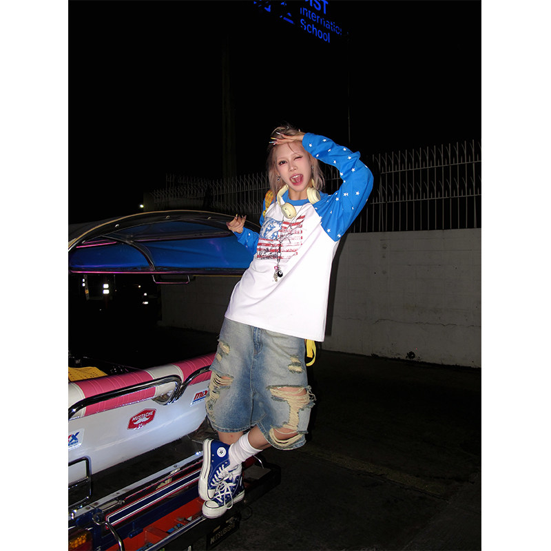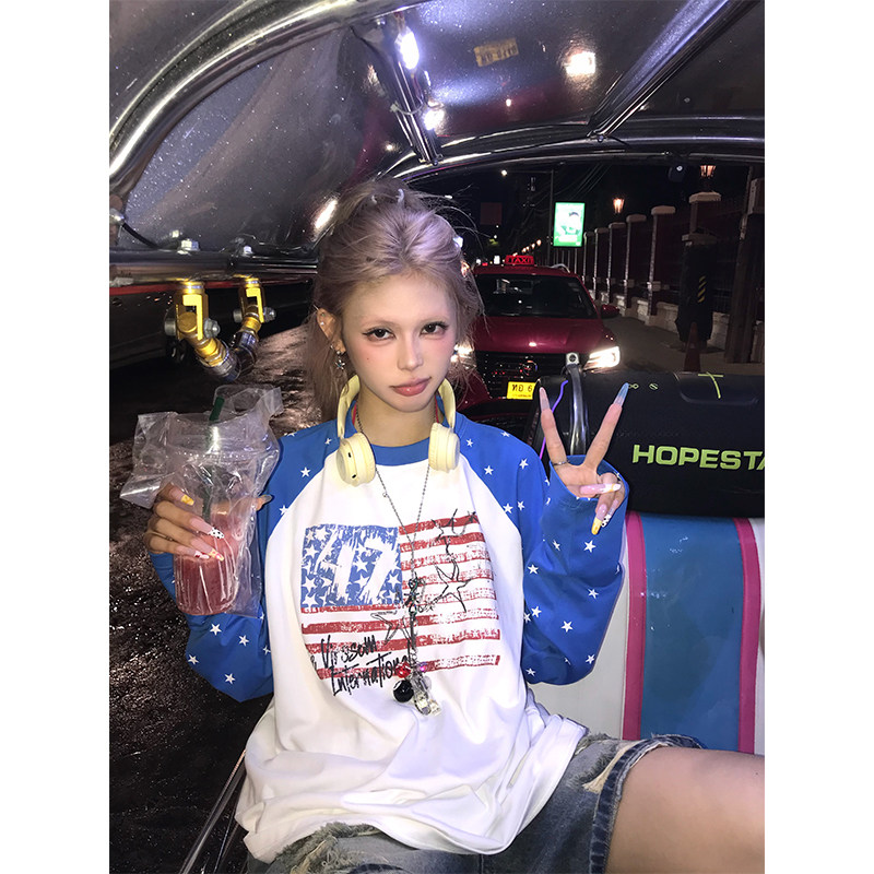 T恤男女宽松休闲百搭上衣 做旧印花长袖 NECOYEP美式 复古星星插肩袖