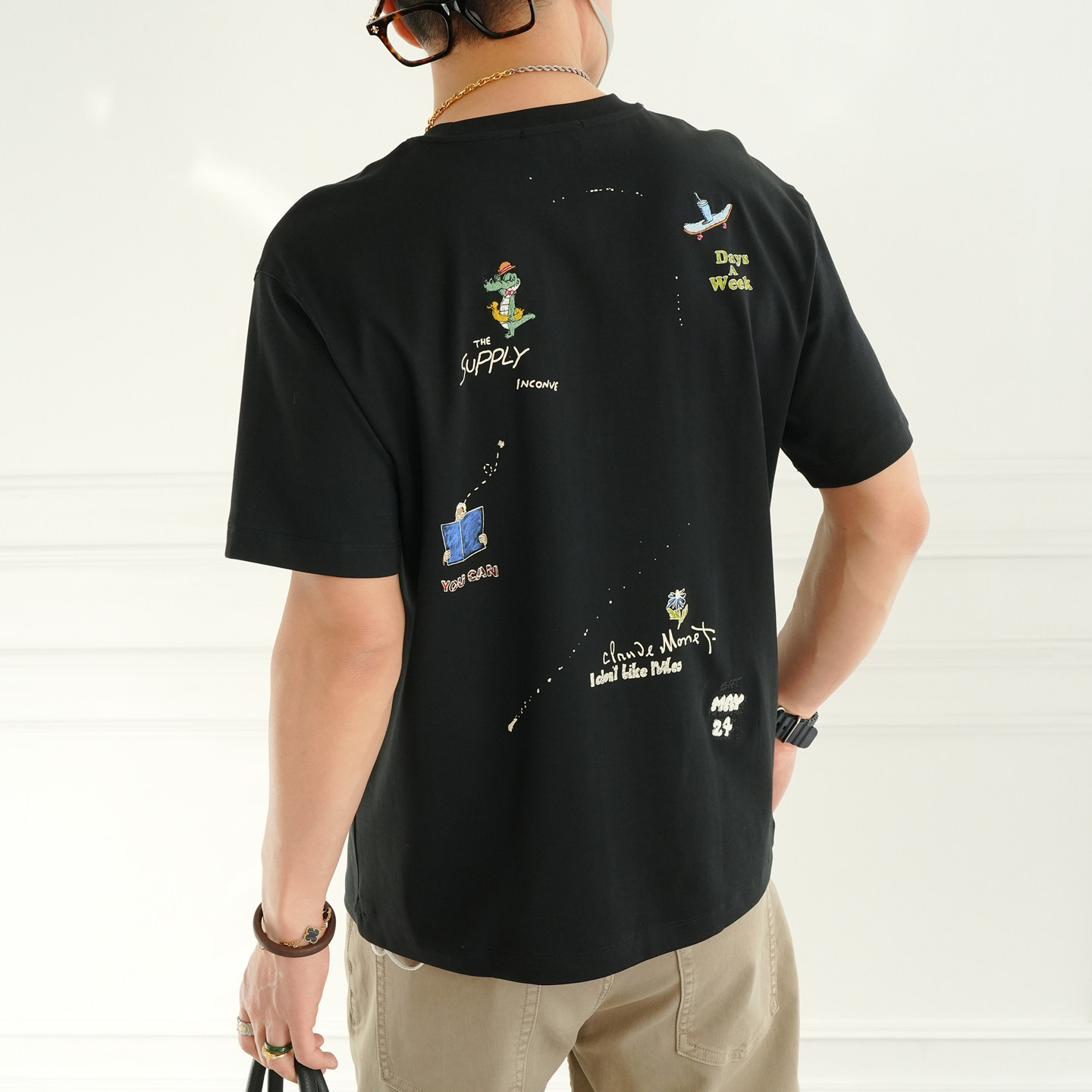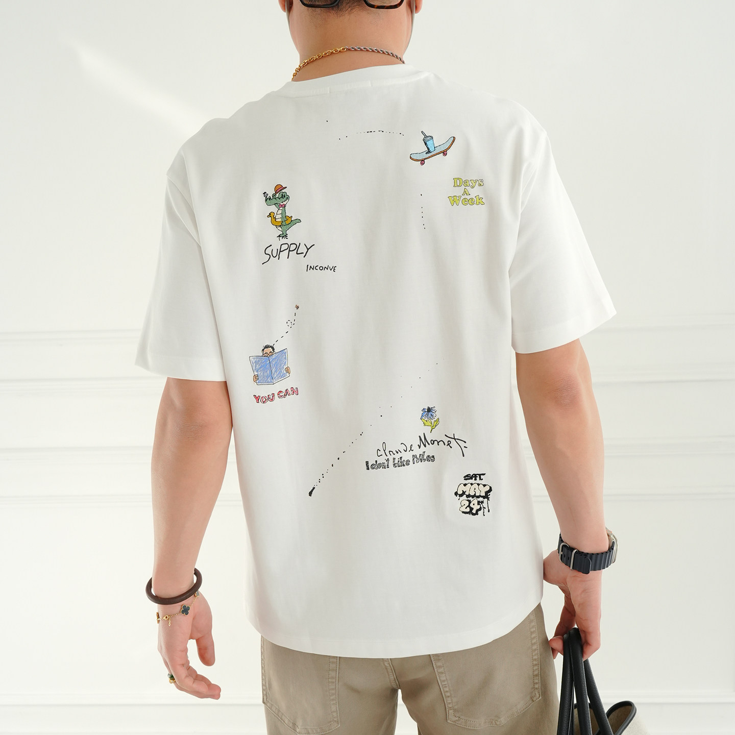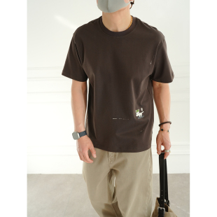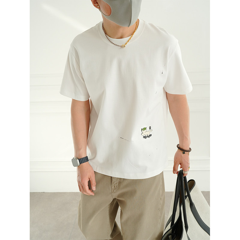 圆领衫 卡通刺绣半袖 T恤男春夏潮流新款 港风原创印花休闲白色短袖