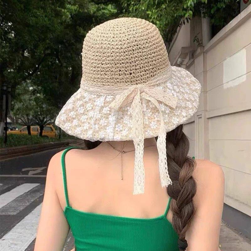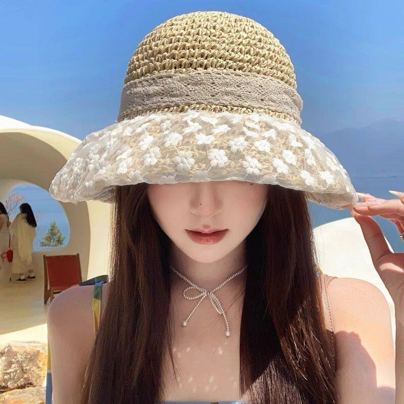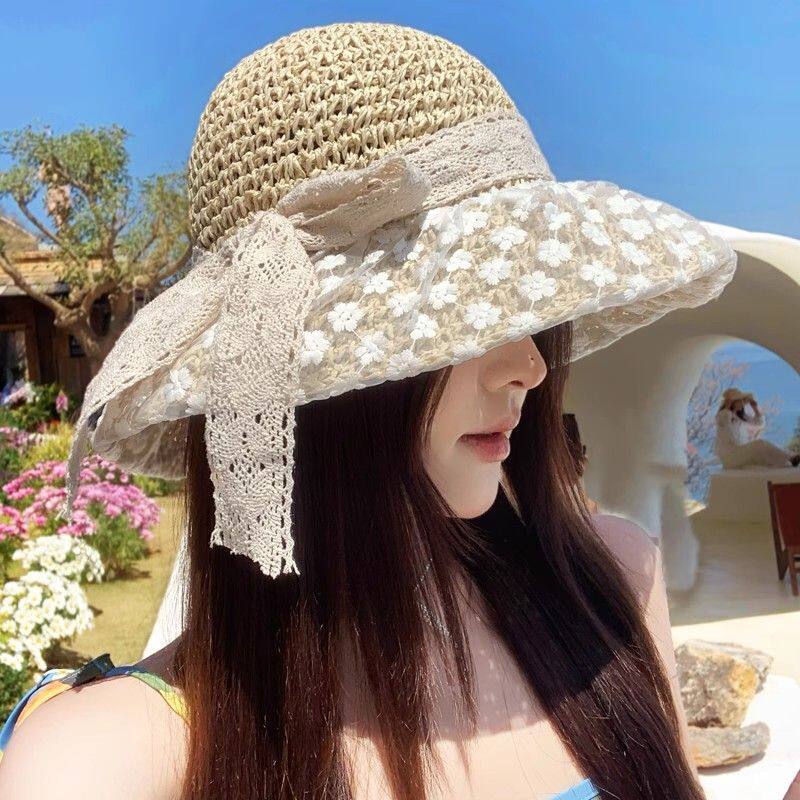 草帽女新款 出游防晒帽大檐沙滩遮阳帽 日系小清新蕾丝草编帽子夏季