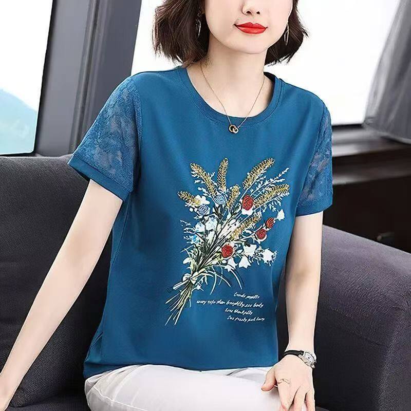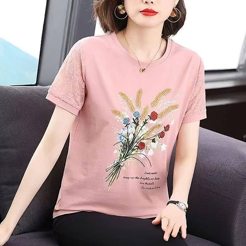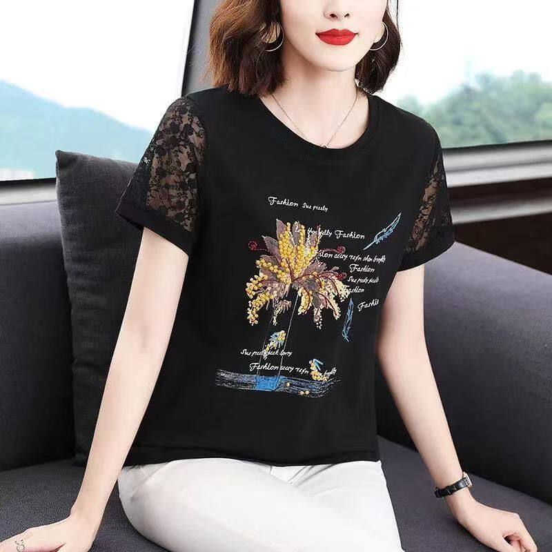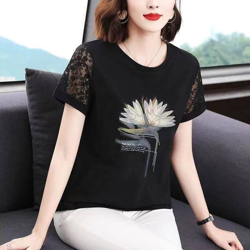 韩版 t恤女夏季 印花上衣宽松大码 蕾丝袖 新款 镂空T恤衫 纯棉短袖