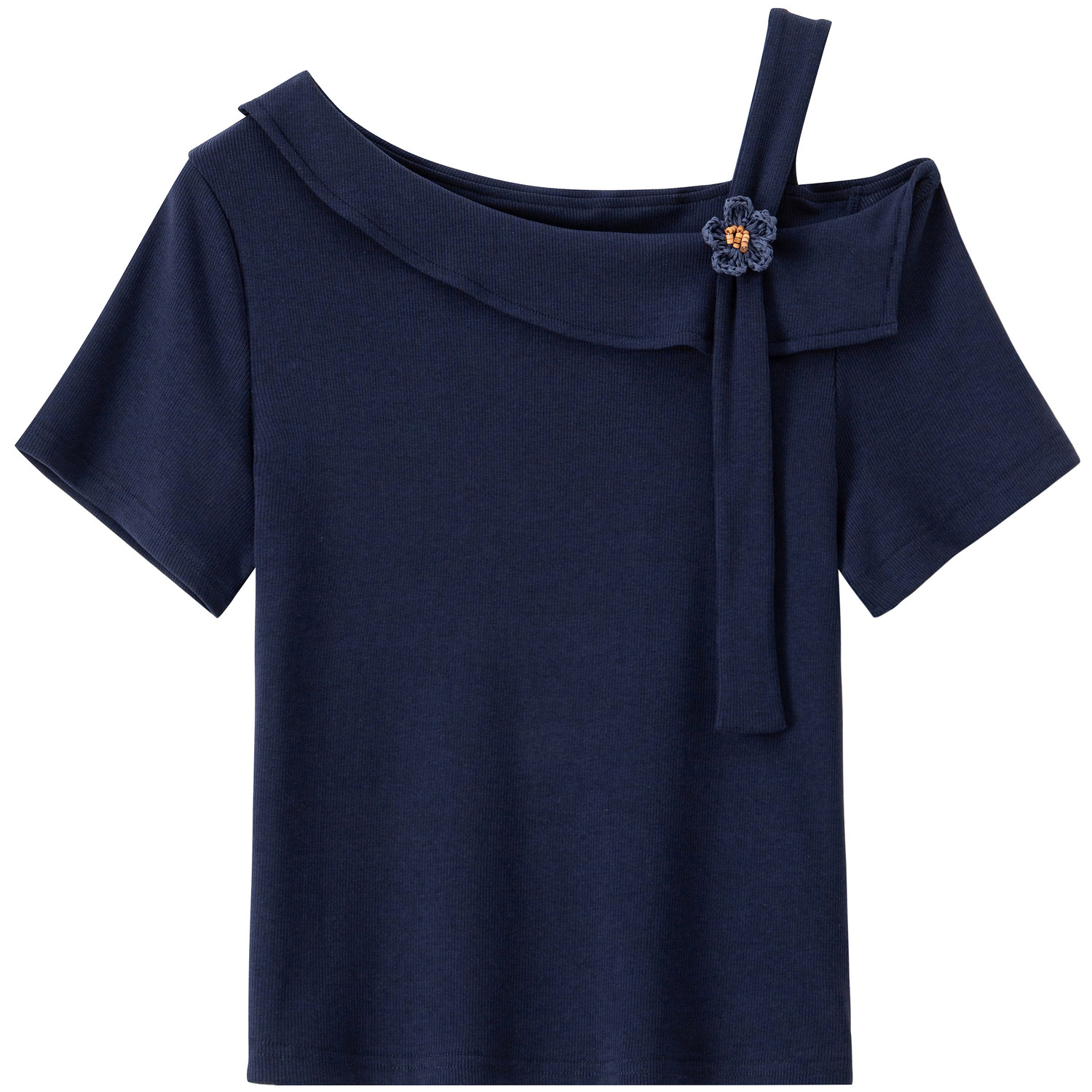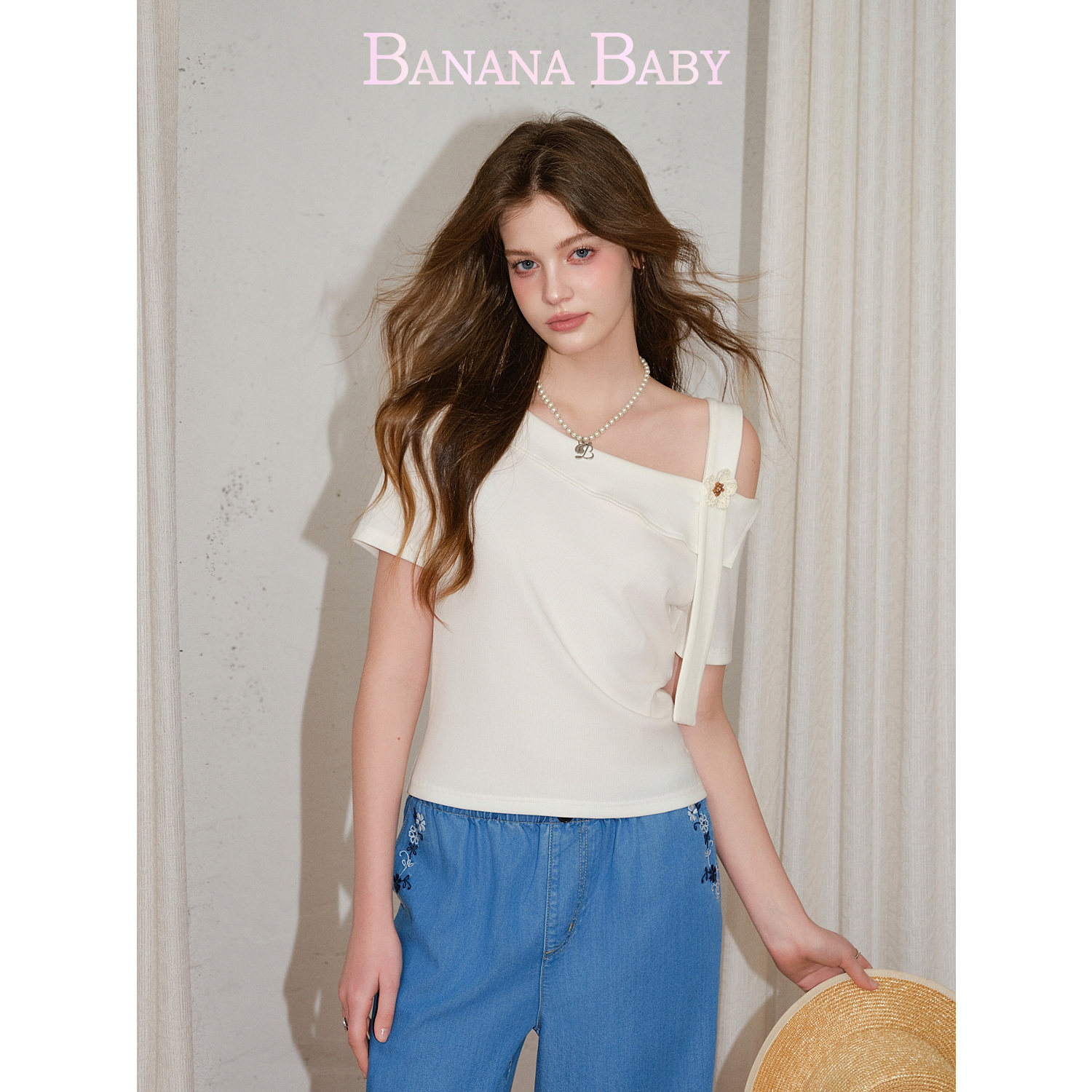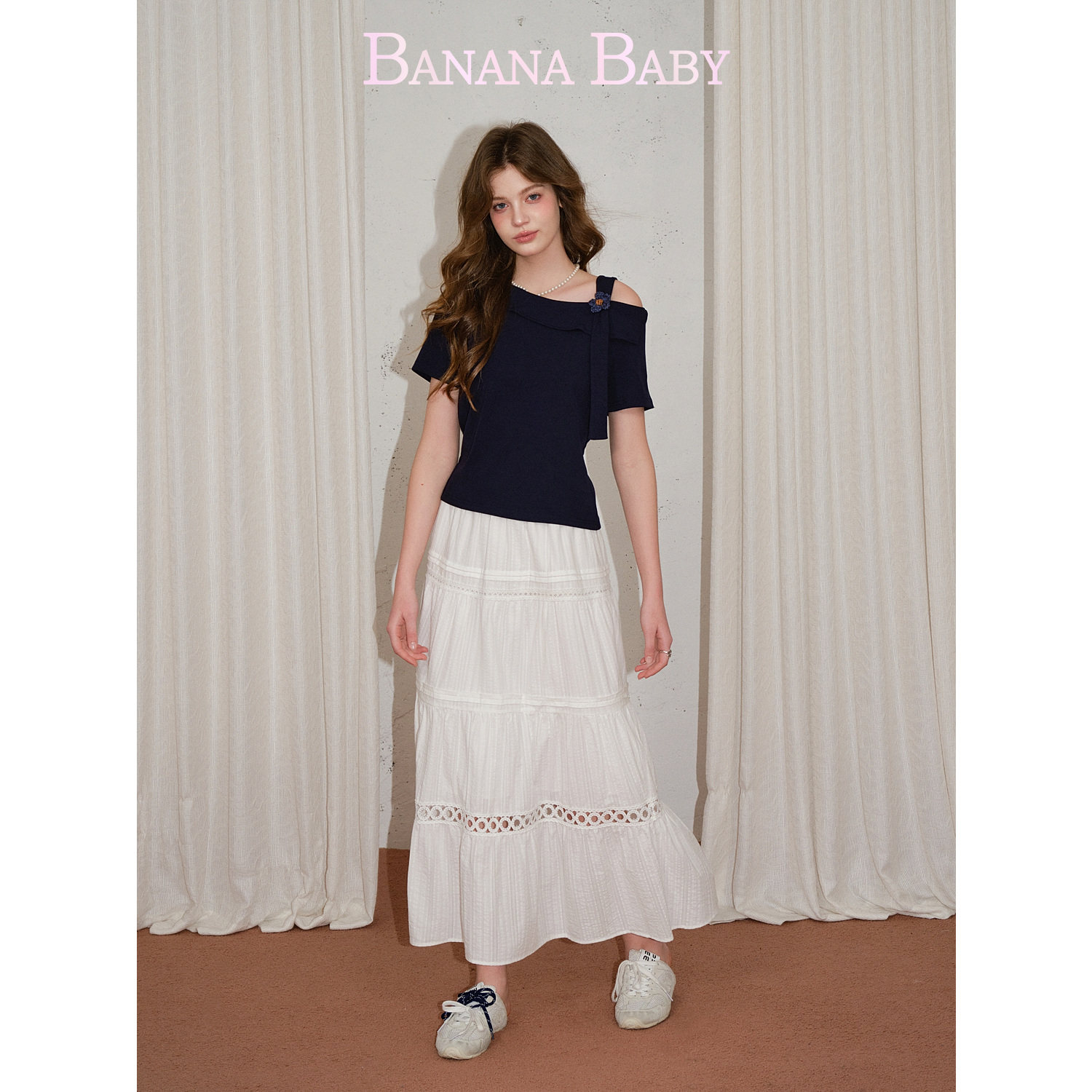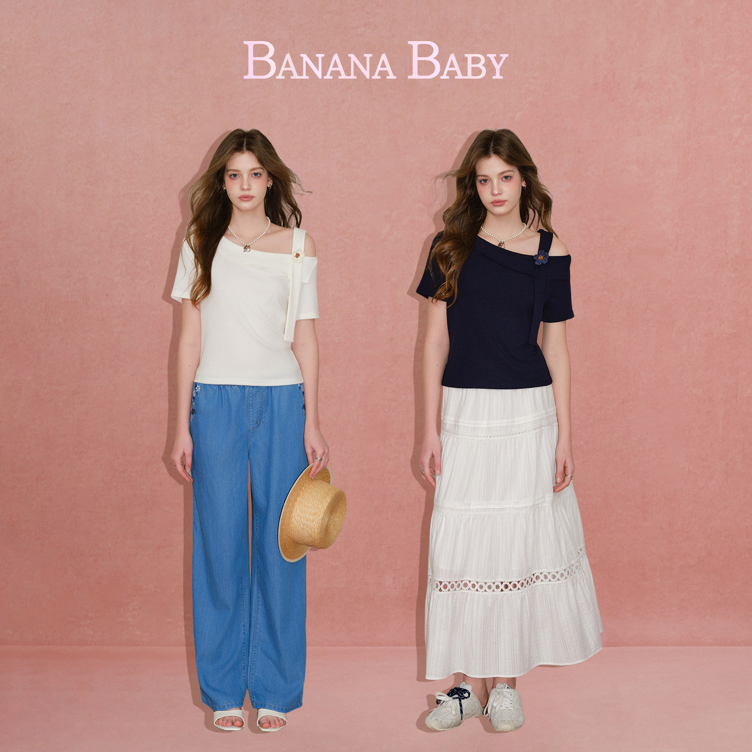 法式 BABY2026年夏新款 BANANA 设计感不对称斜肩钩花T恤 莱赛尔