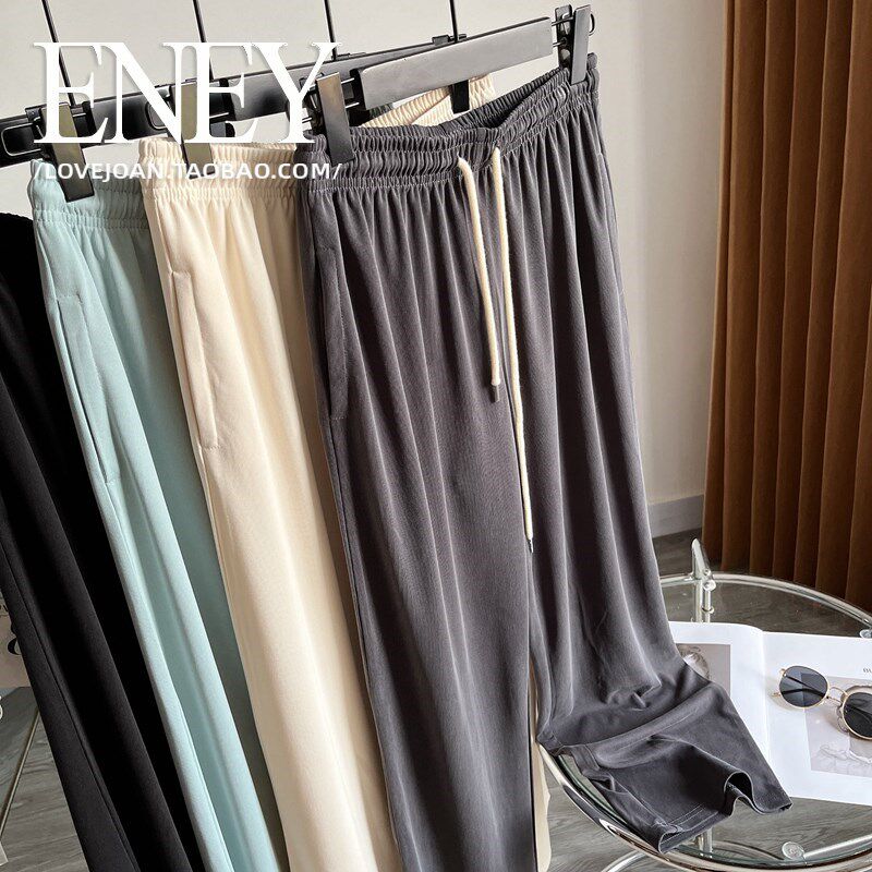 松紧腰长裤 薄P夏季 休 垂感清新薄荷蓝抽绳有口袋铜氨丝直筒L裤 牛