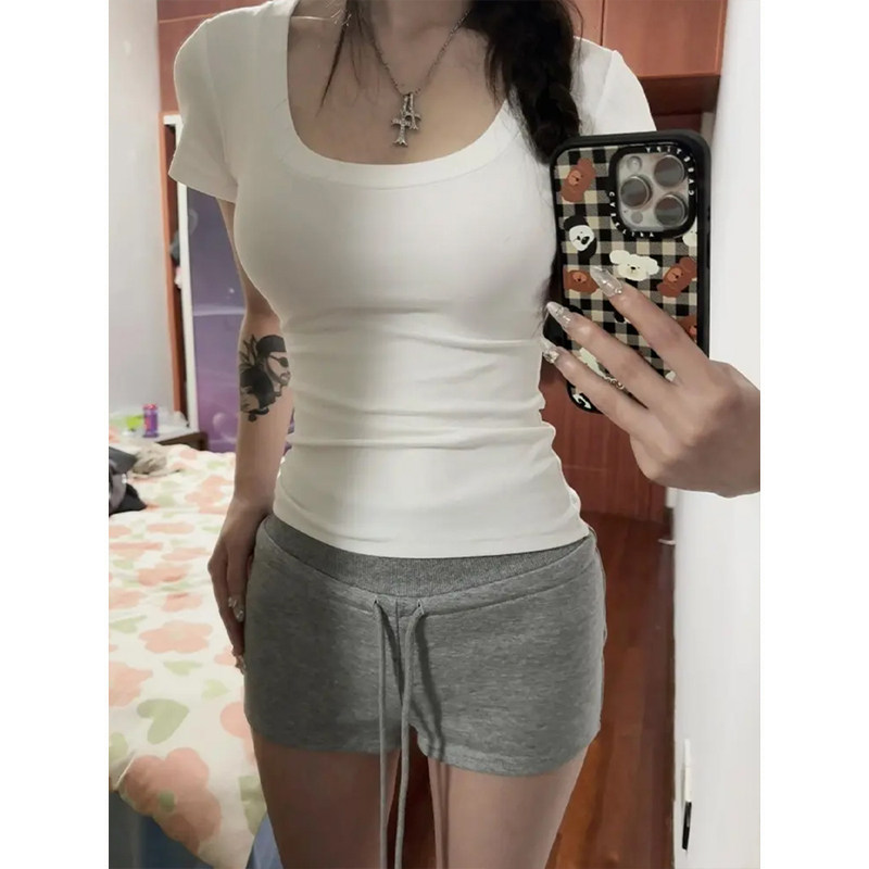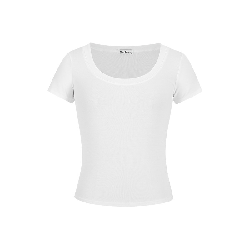 显瘦百搭露锁骨上衣 修身 MosesQueen魔西女王白色u领短袖 t恤女夏季