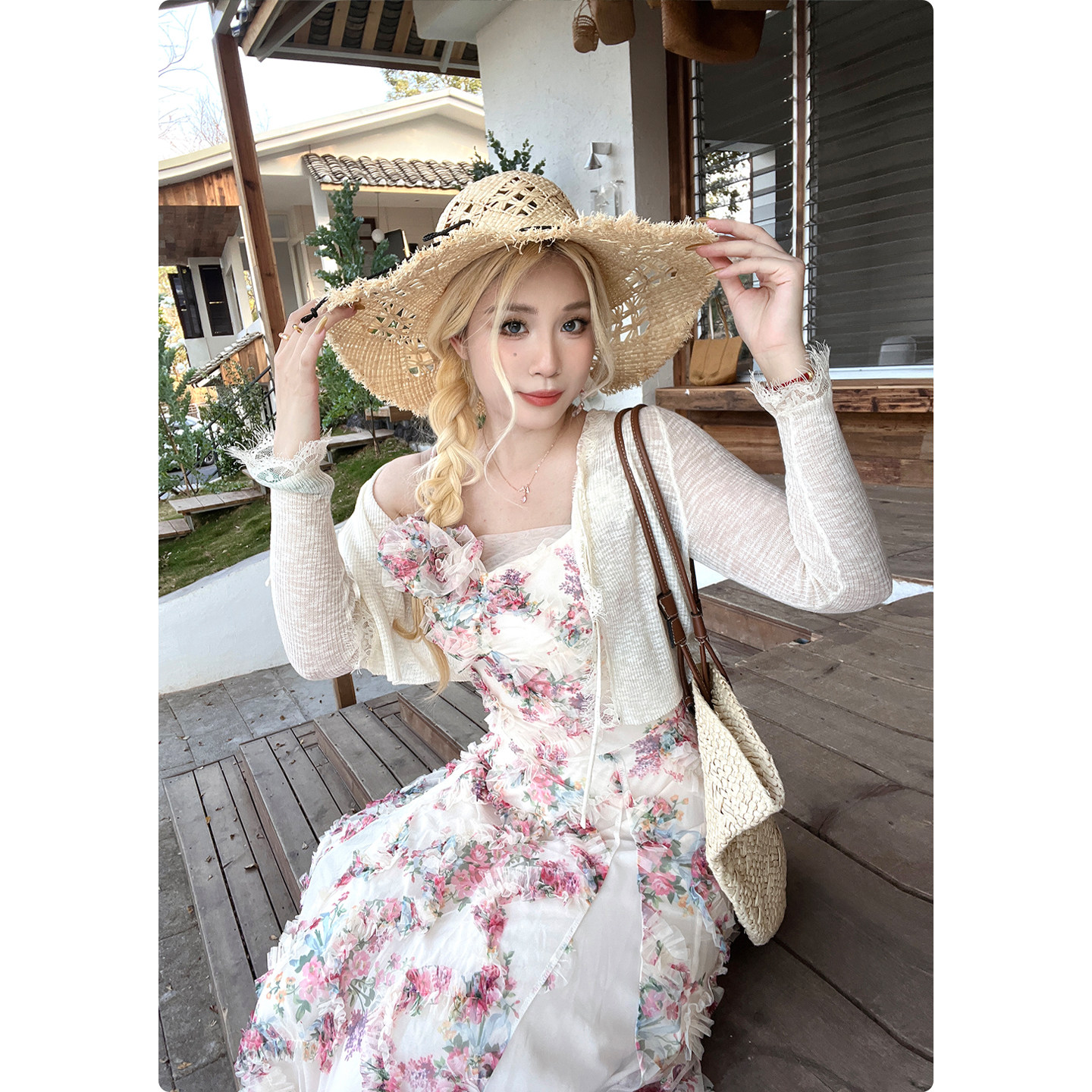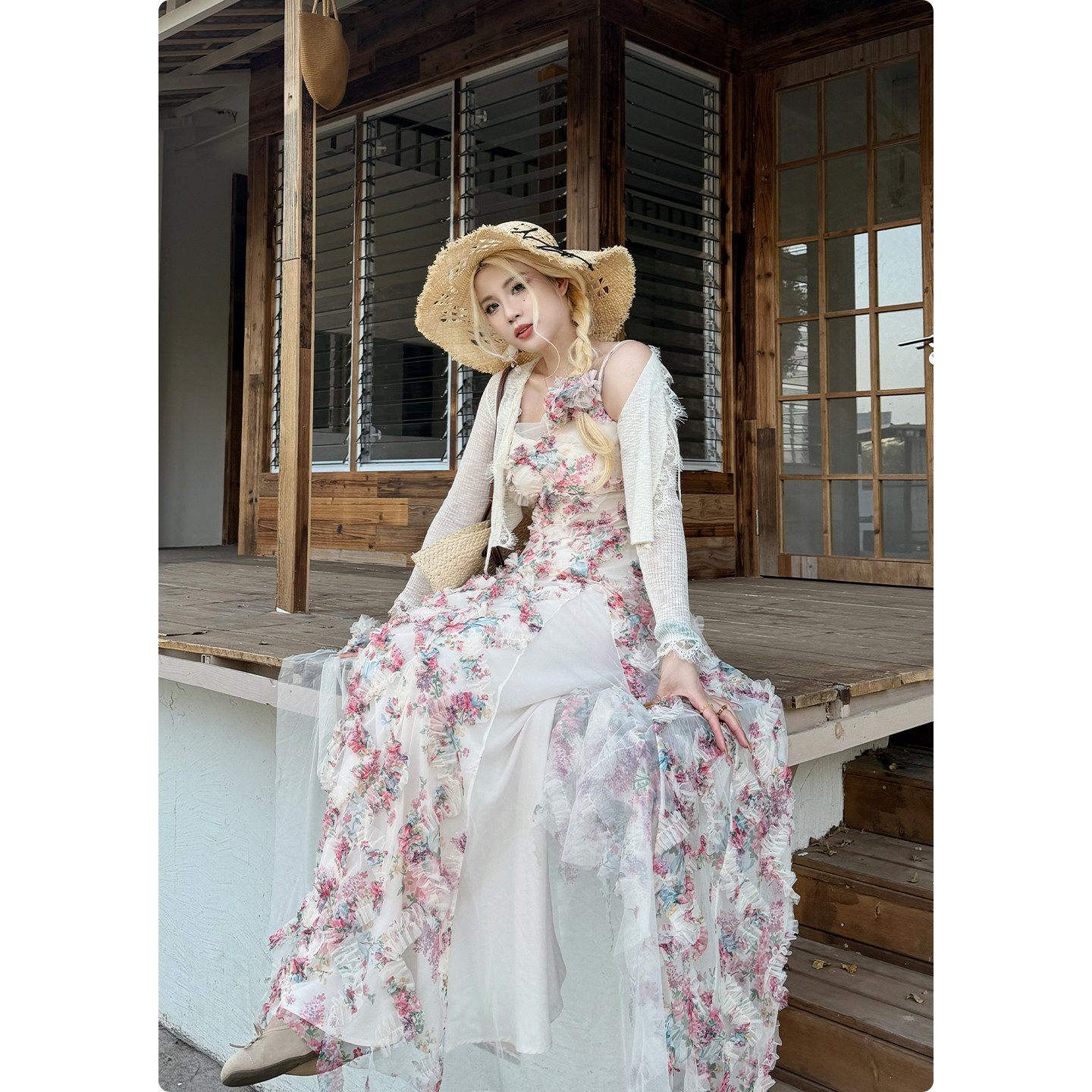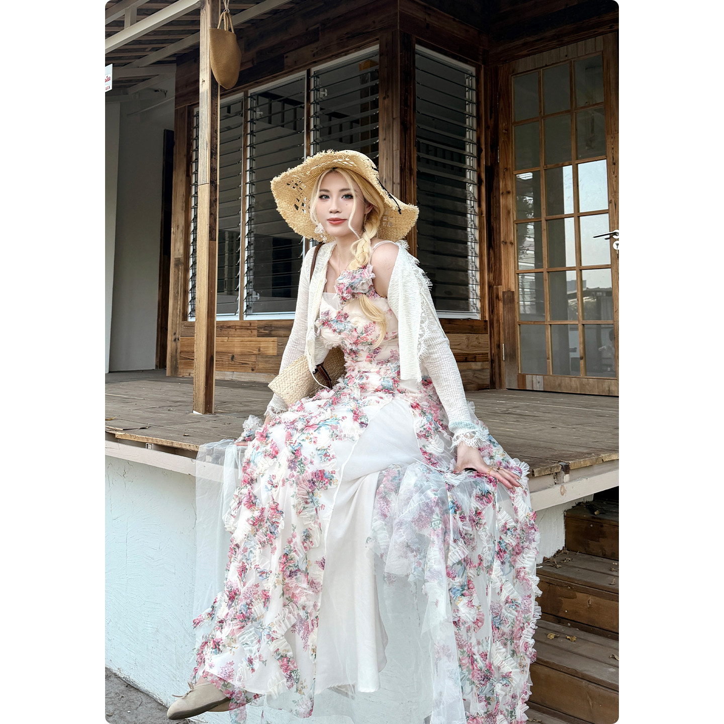 浪漫复古重工立体花朵网纱大码 法式 吊带碎花连衣裙 花仙子 糯米子