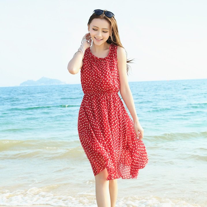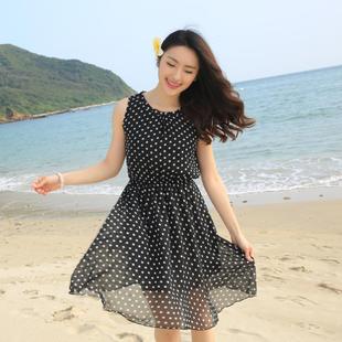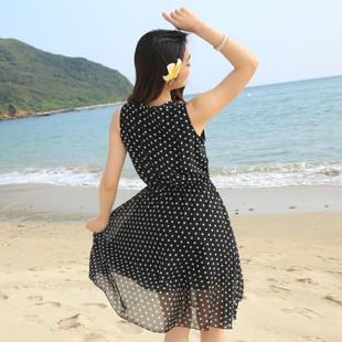 海边度假收腰显瘦波点沙滩裙女 雪纺连衣裙波西米亚中长款 夏季 无袖