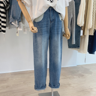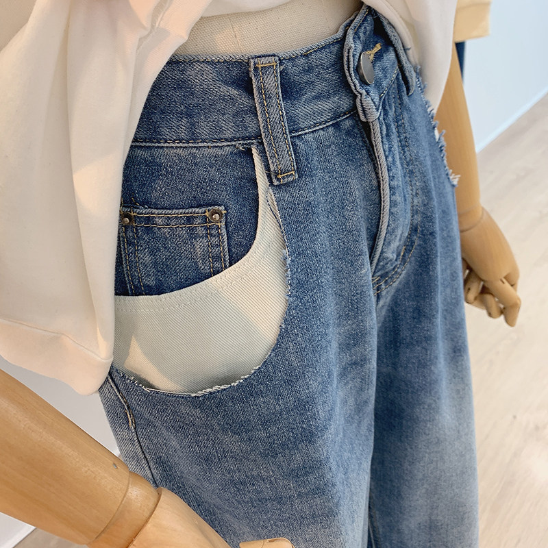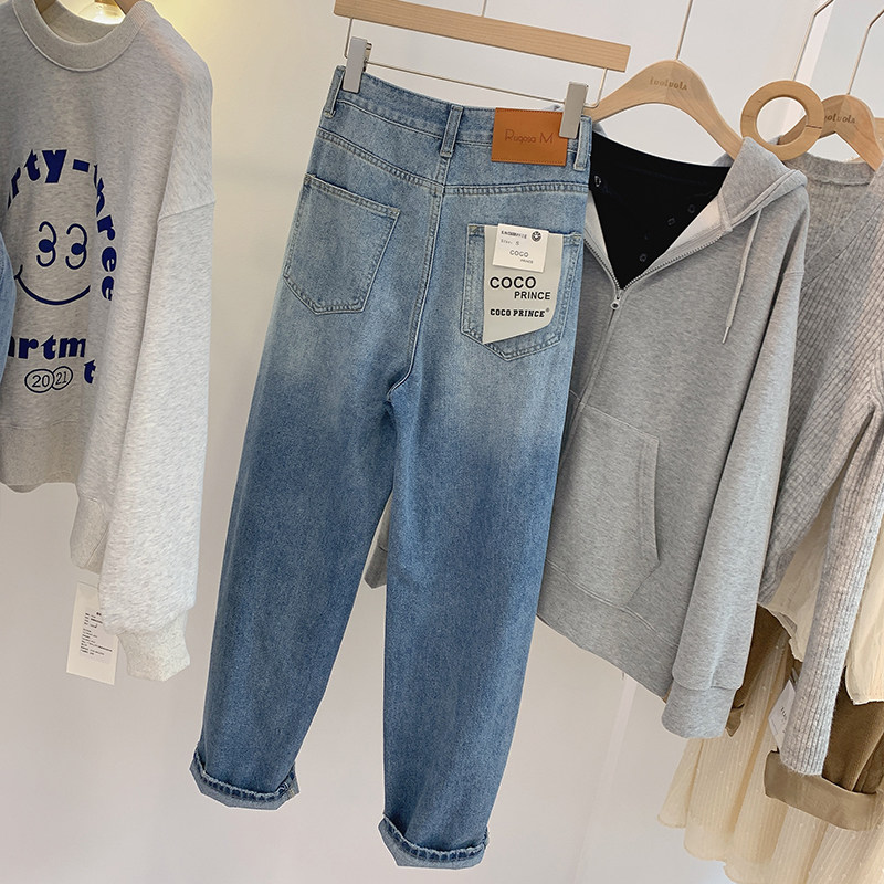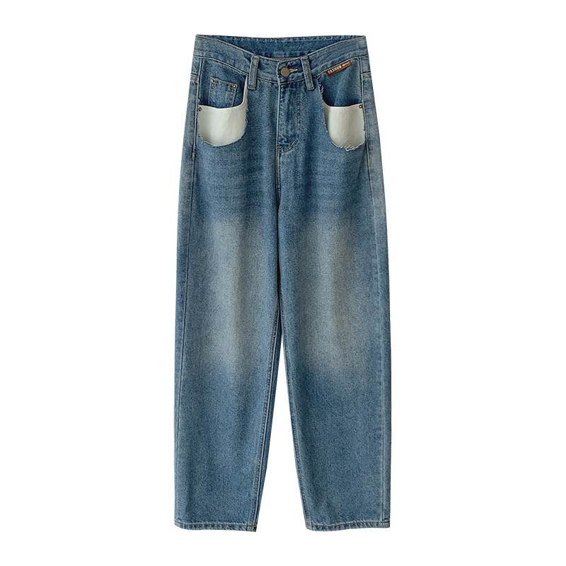 口袋拼接浅色水洗宽松长裤 洛洛拉 韩版 女秋新款 子 高腰哈伦牛仔裤