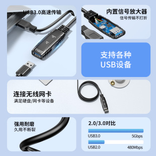 10m加长线鼠标键盘摄像头u盘打印机网卡数据线带供电连接线 20米USB延长线3.0公对母信号放大器5 达而稳