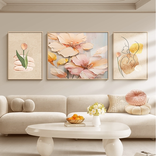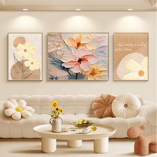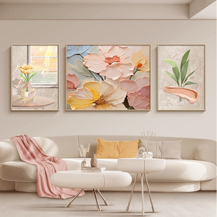 奶油风大芬油画村客厅装 饰画简约肌理感花卉三联挂画高级艺术壁画