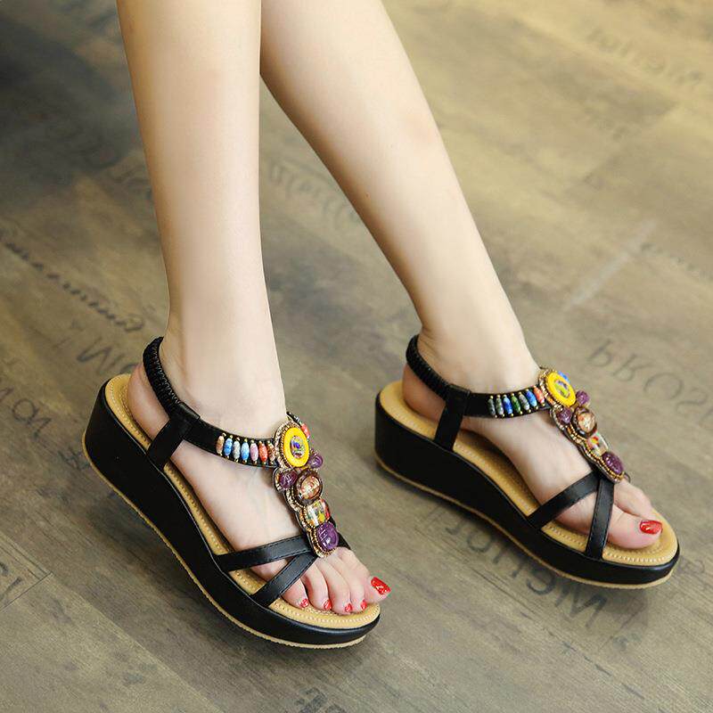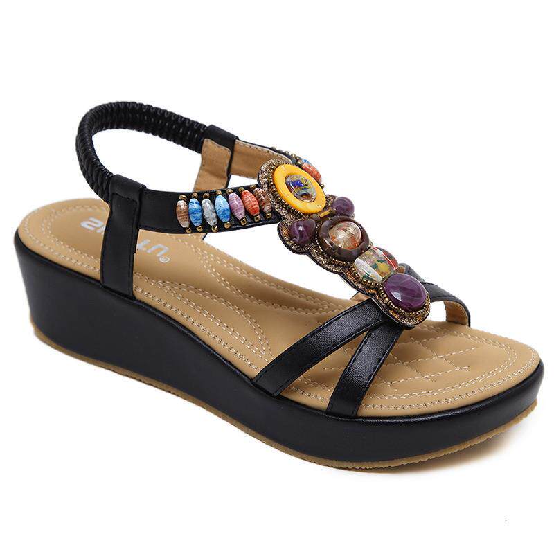 波西米亚鞋 大码 女鞋 19新款 4坡跟串珠轻便简约淑女鞋 凉鞋 2115 韩版