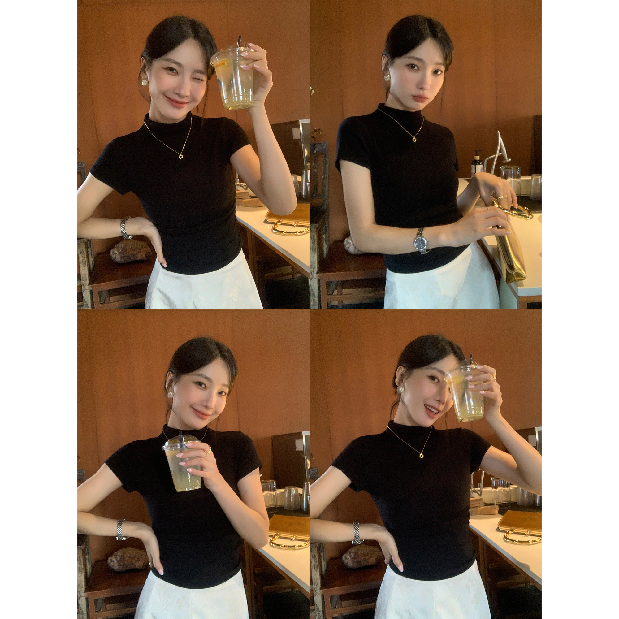 显瘦打底衫 T恤女春秋修身 正肩上衣 黑色半高领针织短袖 pusumede