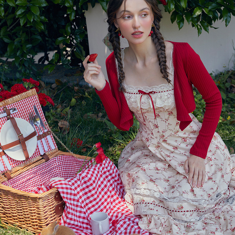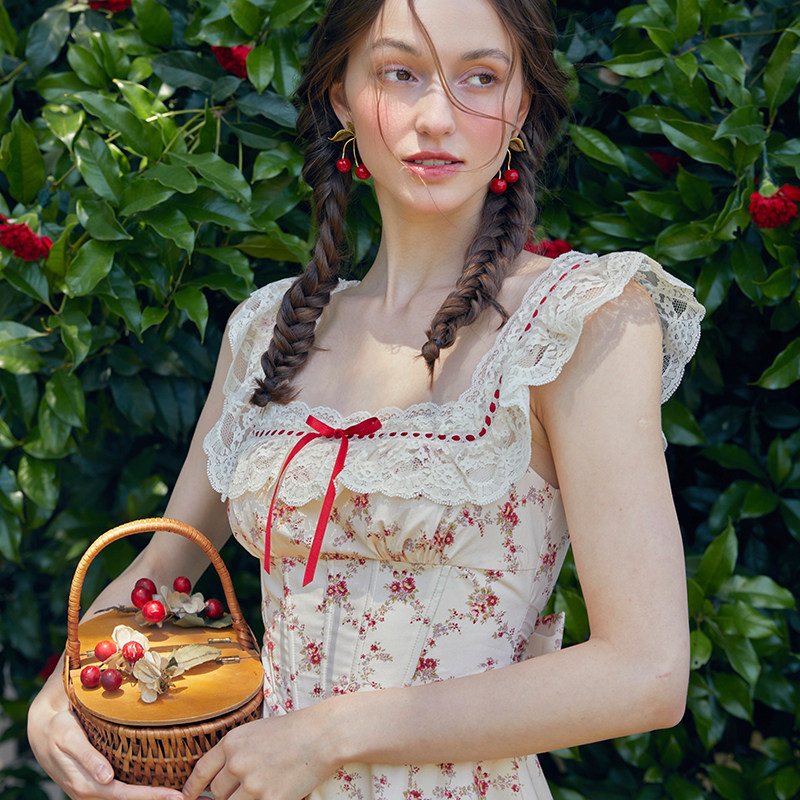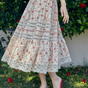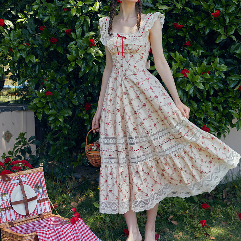 棉田园蕾丝印花衣连衣裙通勤鱼骨裙方领女夏 法式 LaceMade 红石榴