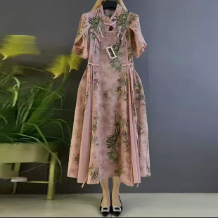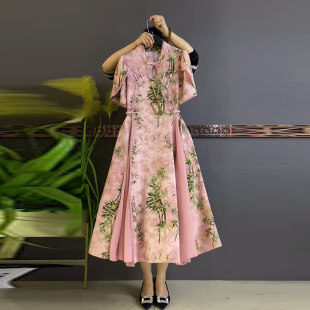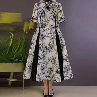 加大码 立领盘扣镂空竹叶连衣裙胖MM气质国潮收腰显瘦大摆长裙 女装