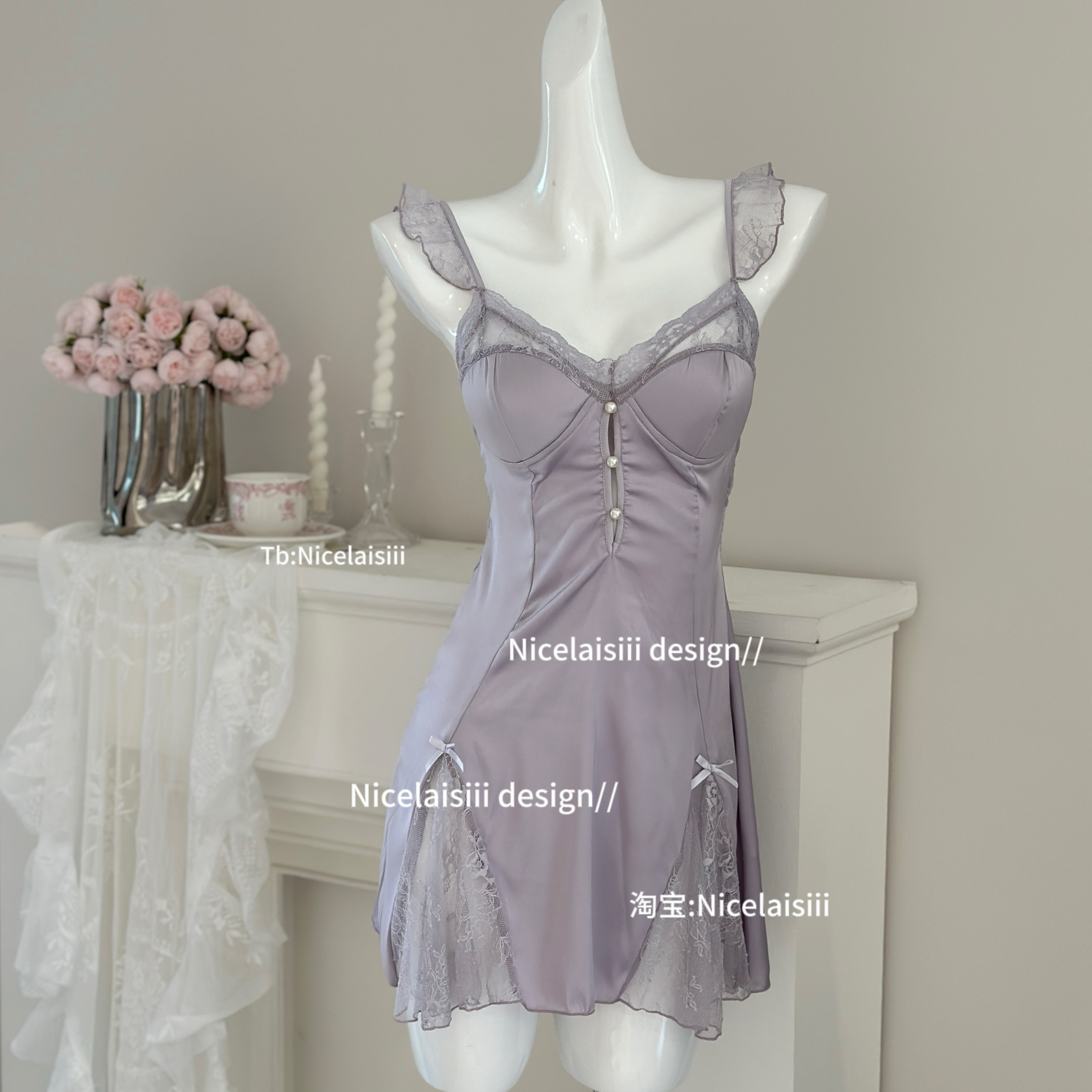 Nicelaisiii晚香玉 缎面蕾丝吊带性感睡衣夏 纯欲风带胸垫睡裙法式