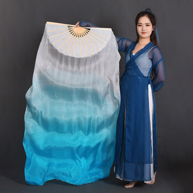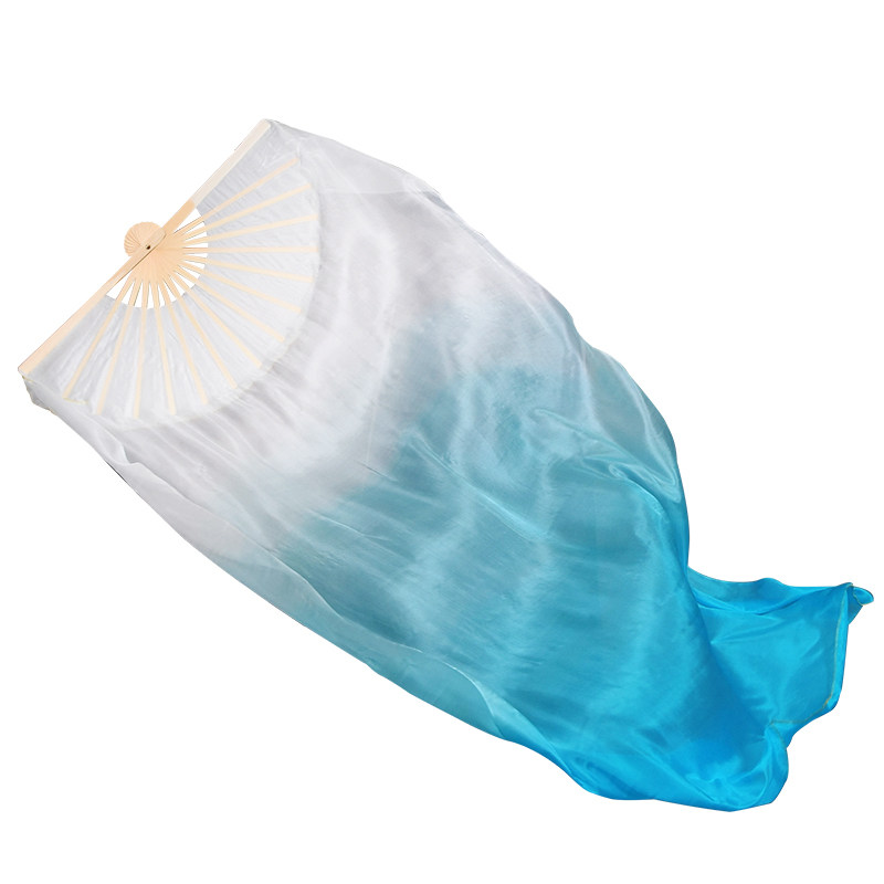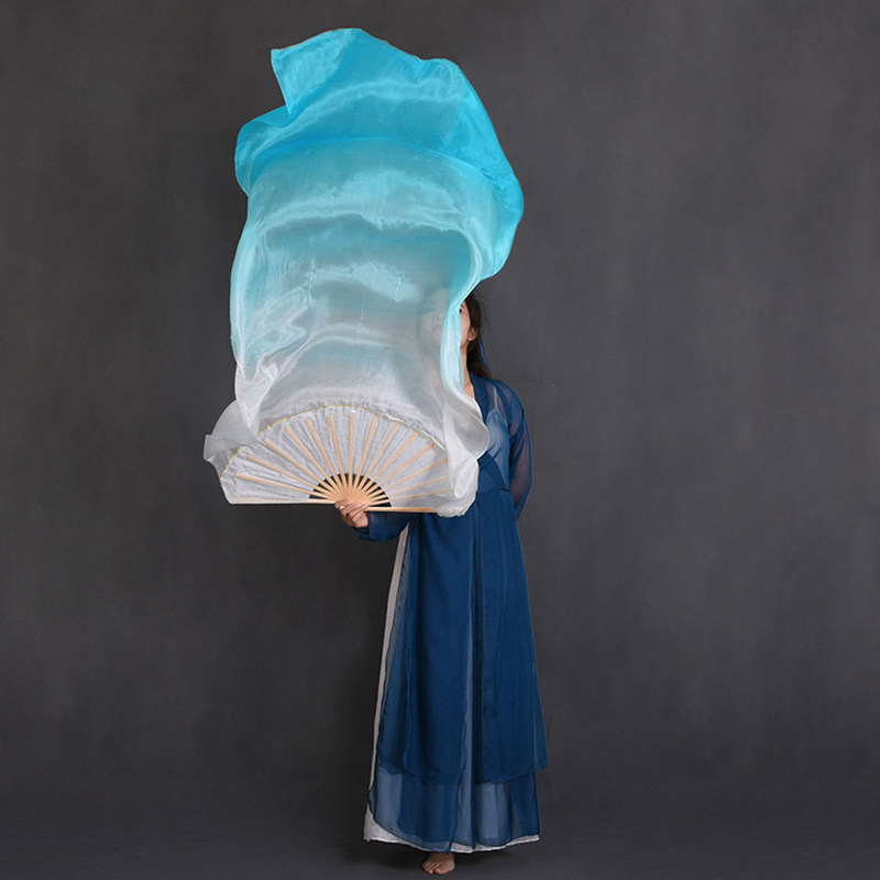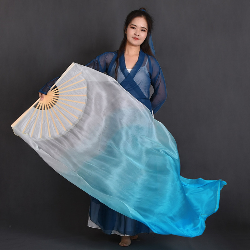 舞蹈扇子真丝长飘白湖蓝渐变古典舞一条大河化身孤岛 鲸加长绸扇