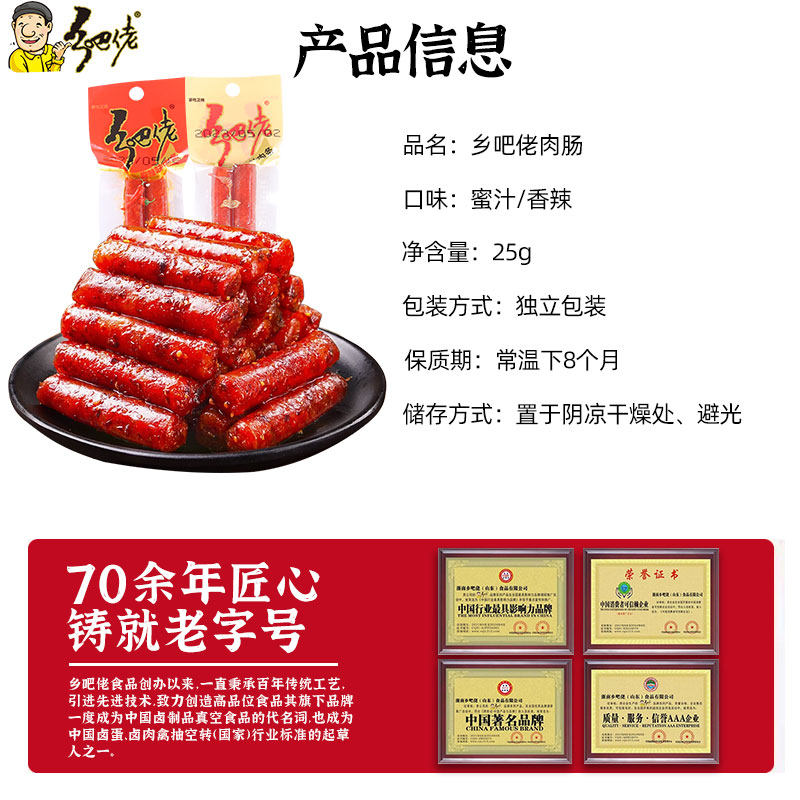正宗乡吧佬肉肠香麻辣蜜汁肉条乡吧佬广式 腊肠即食小香肠零食小吃