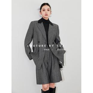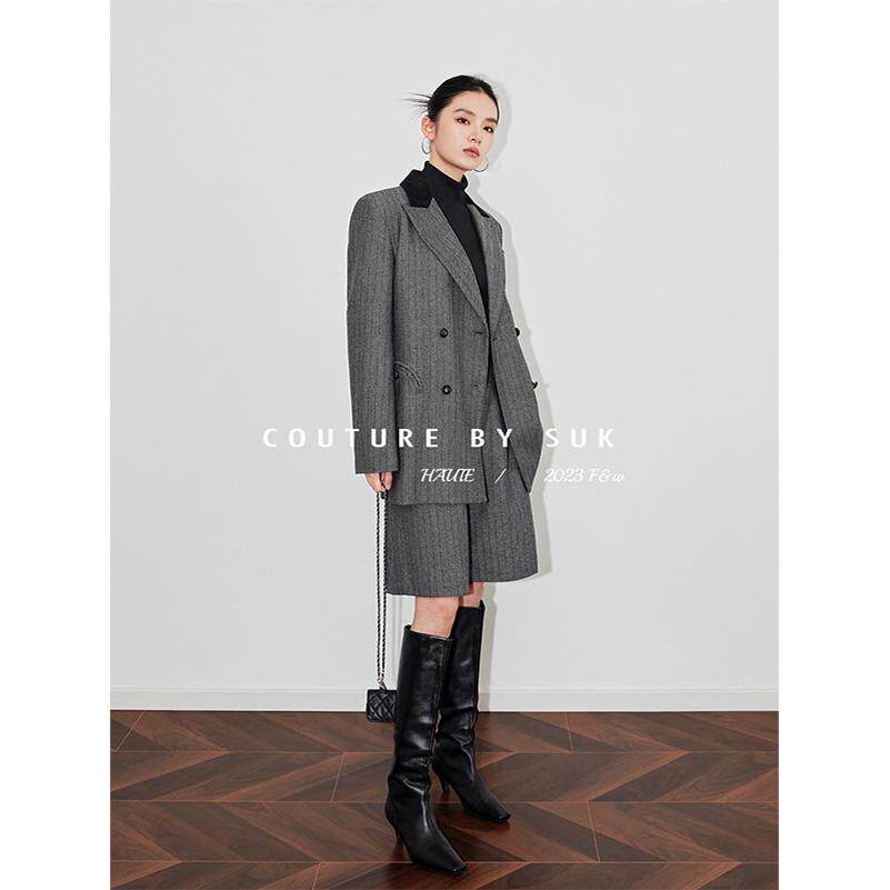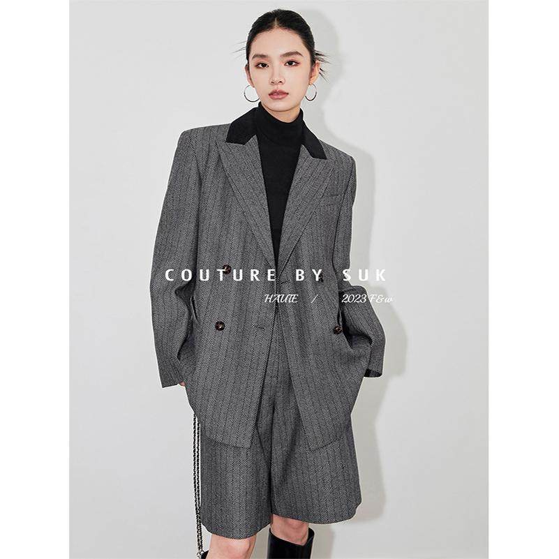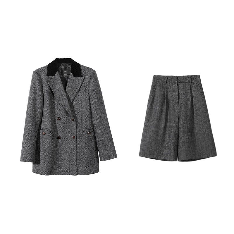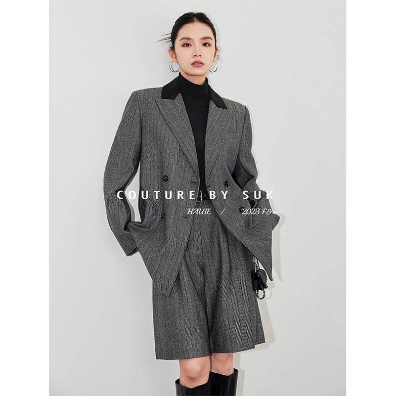 套装 SUK 中裤 灰色羊毛毛呢外套拼接两件套职业西装 女 时髦精本人