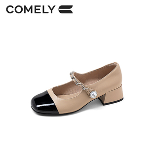 女法式 珍珠漆皮粗跟单鞋 miu 仙女风小皮鞋 方头高跟鞋 复古玛丽珍鞋