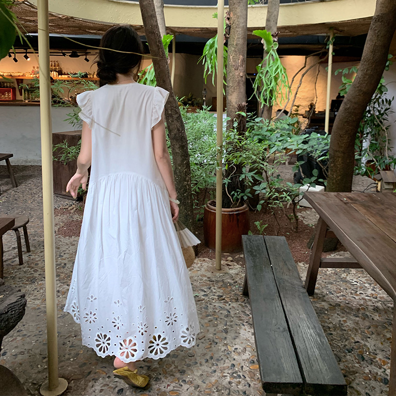 长裙2024夏季 渔小平 法式 镂空刺绣小飞袖 小白裙超好看连衣裙 福团