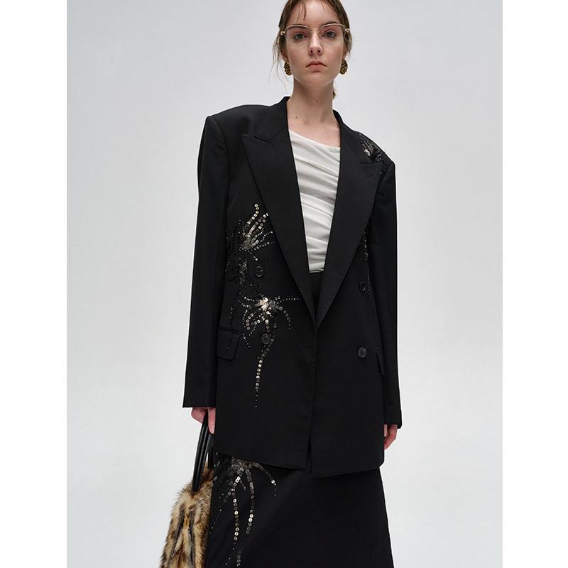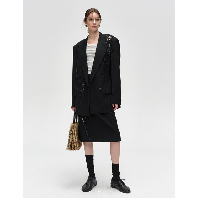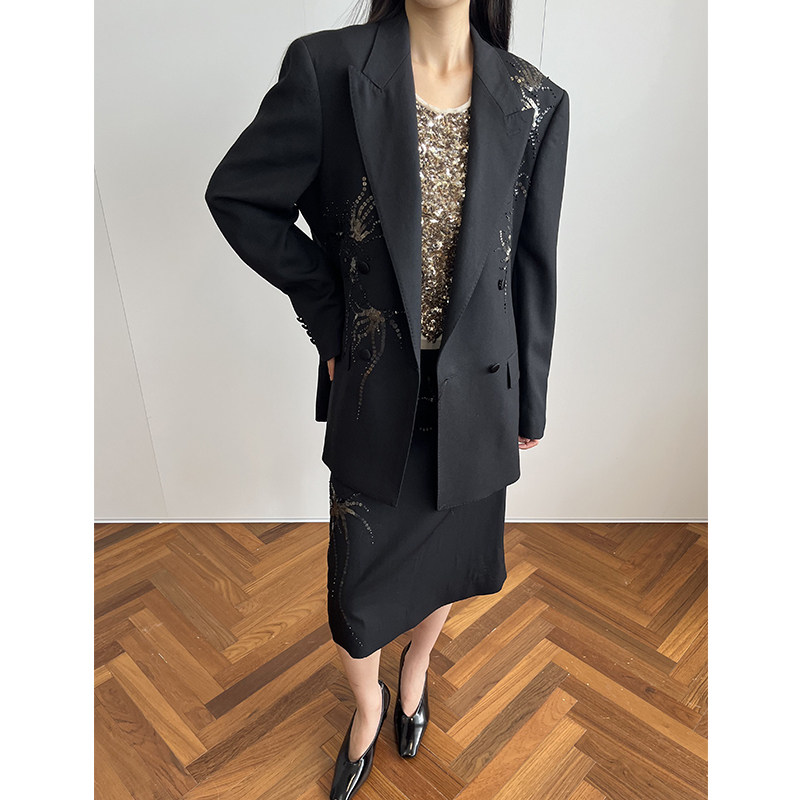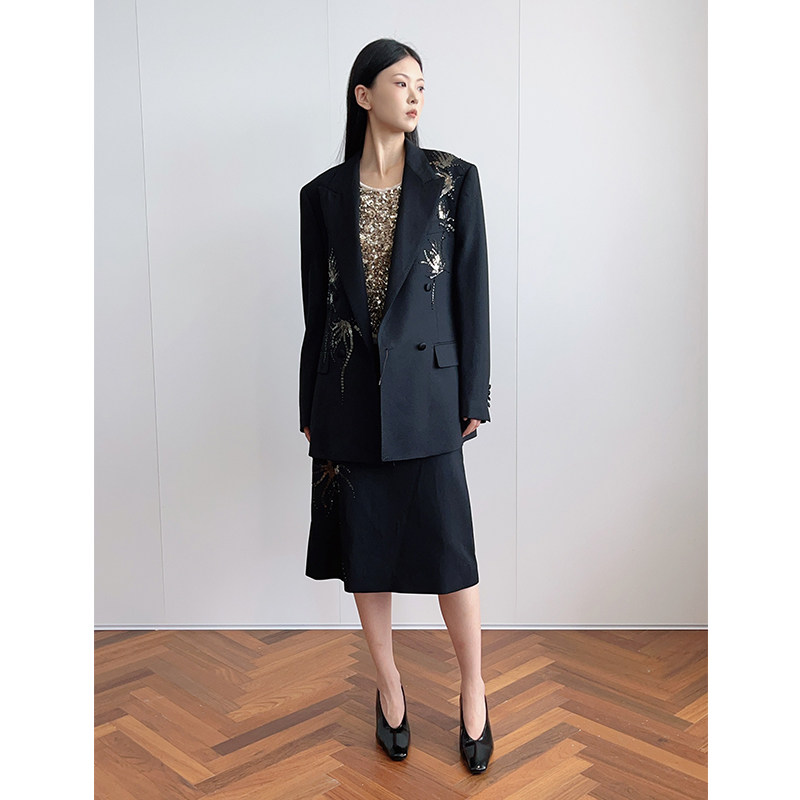 WEI 正品 24AW秋冬新款 外套裙子套装 授权 ⿊⾊亮⽚⽺⽑⻄装 JACQUES