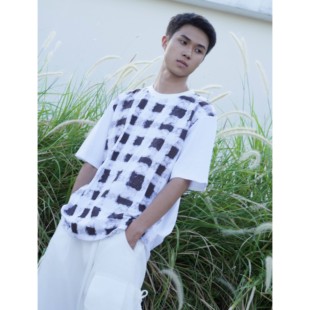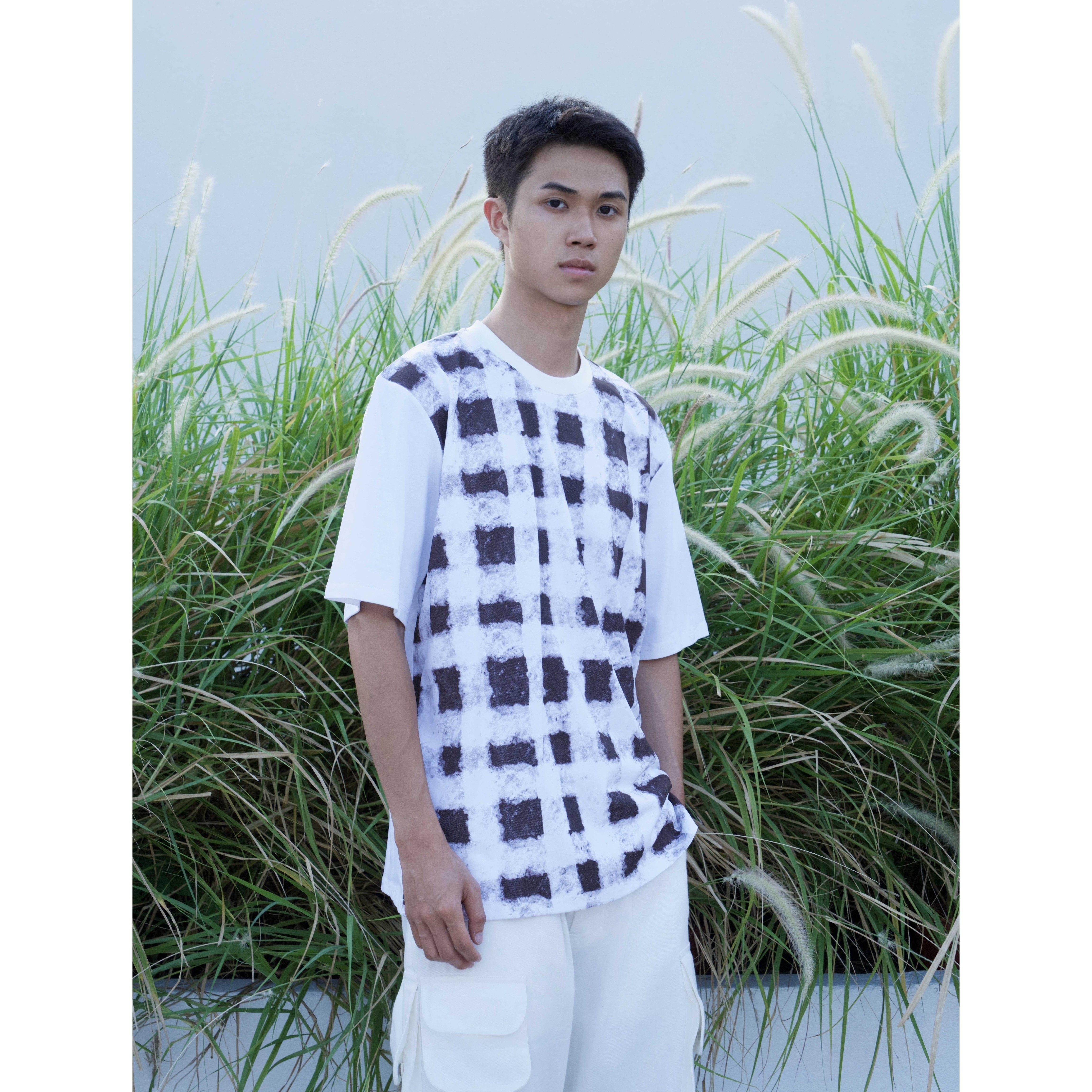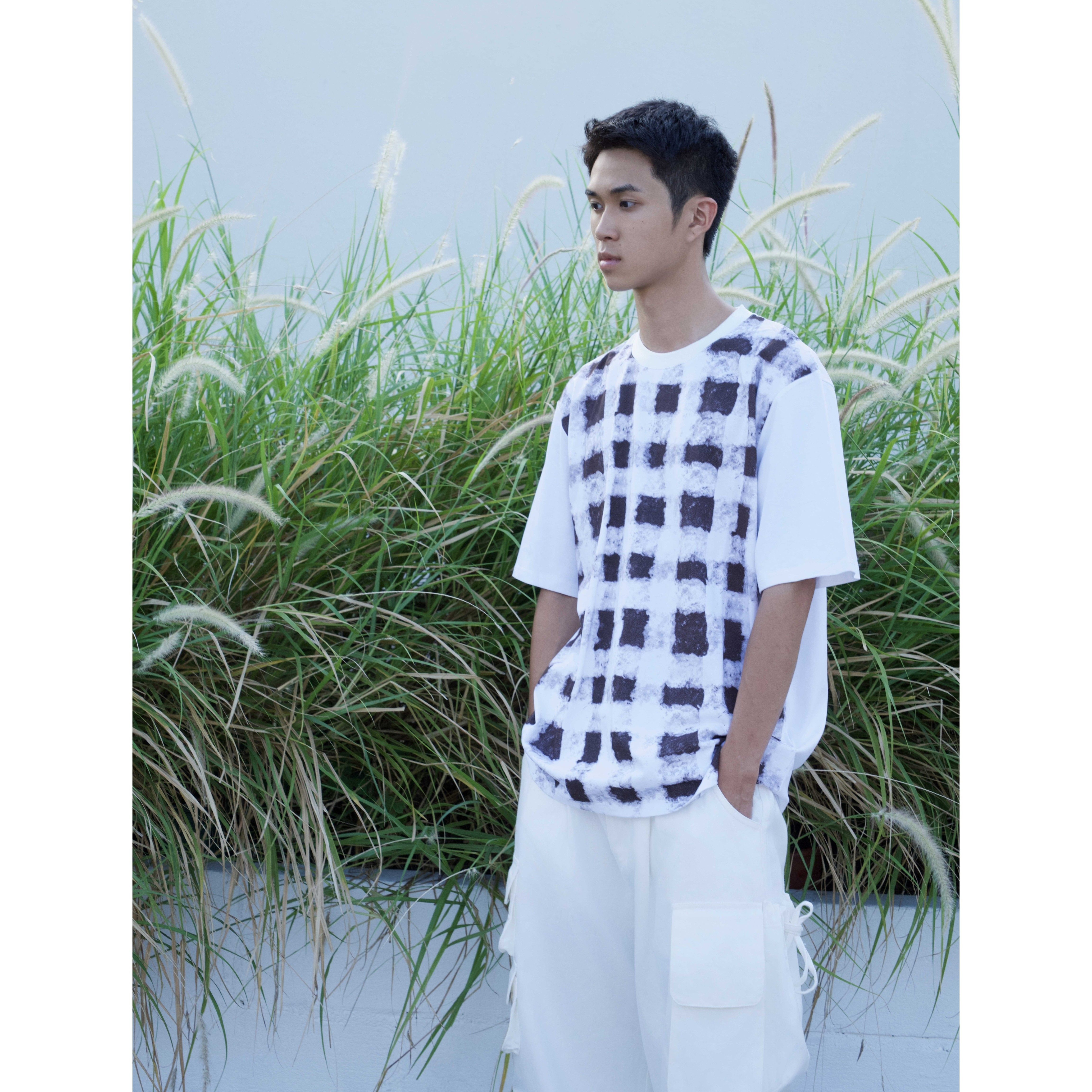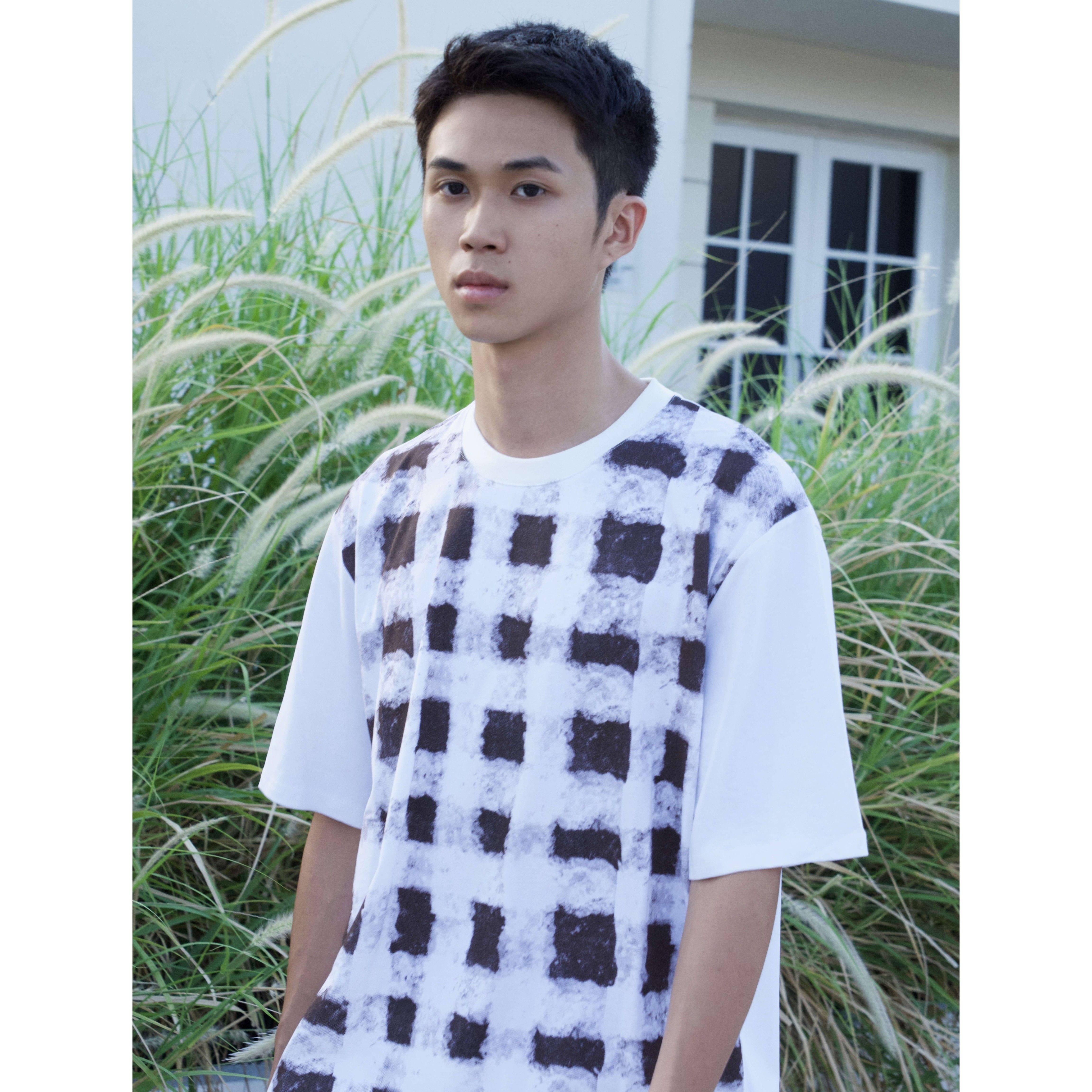 wave系列 全棉针织T恤男女同款 YOWSAH 植物染咖色方块印花短袖