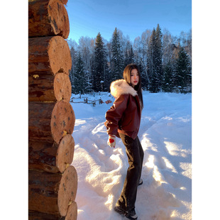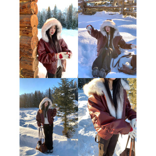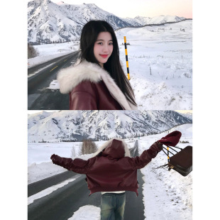 Joeyoo秋冬宽松大毛领酒红色皮衣女2025新款 加厚保暖连帽外套短款