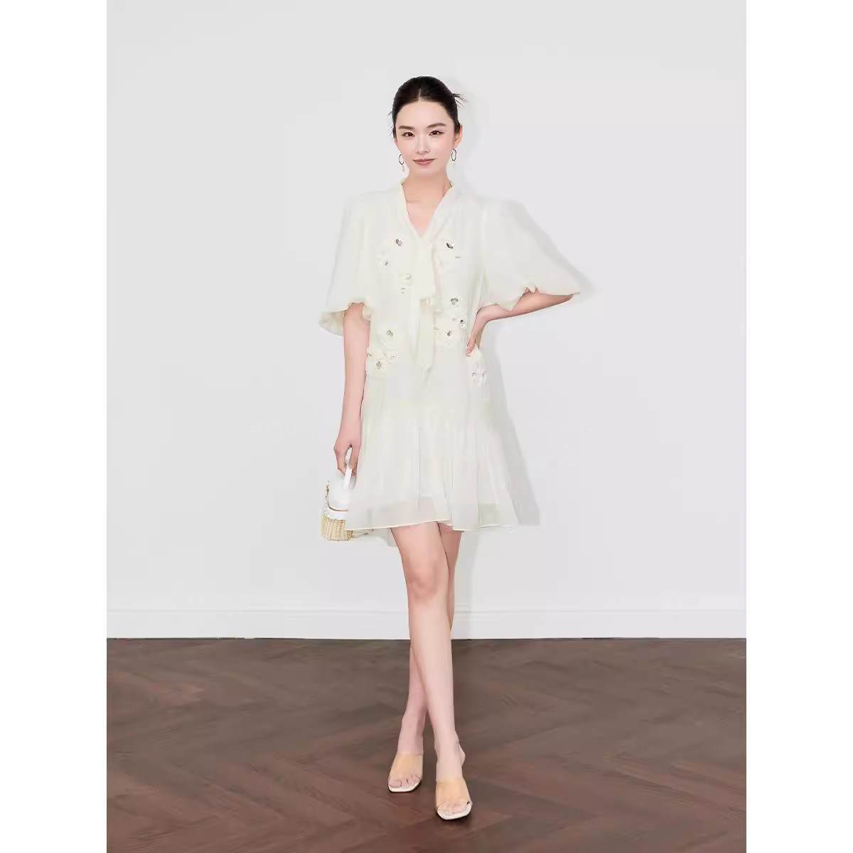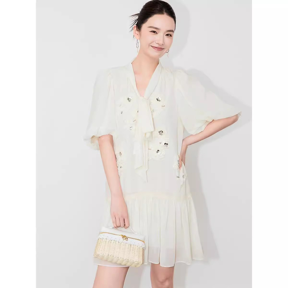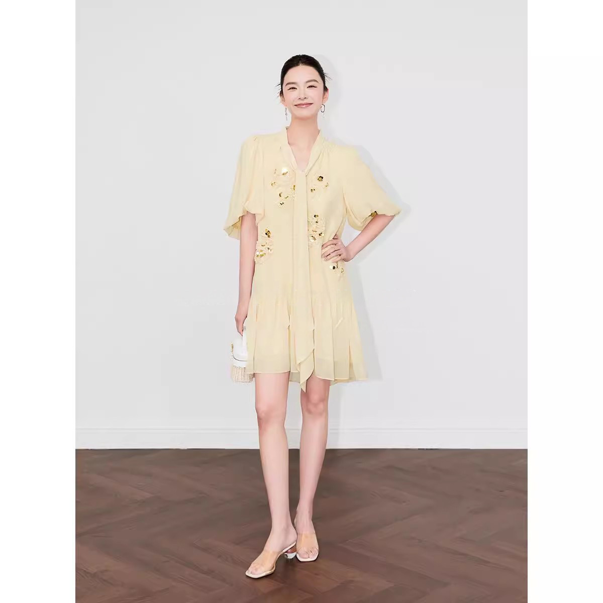 连衣裙女 裙子飘带宽松中长款 爵莱菲大码 亮片盘绣V领通勤法式