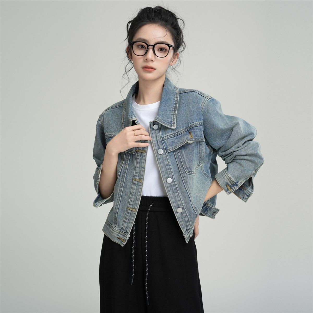 上衣 POLO领牛仔褂夹克短款 复古水洗蓝牛仔外套女春秋2025春季 新款