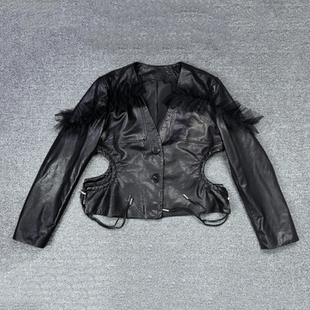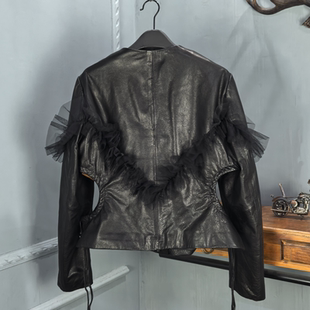 时尚 牛皮拼接网纱镂空显瘦百搭外套 设计感真皮皮衣女短款