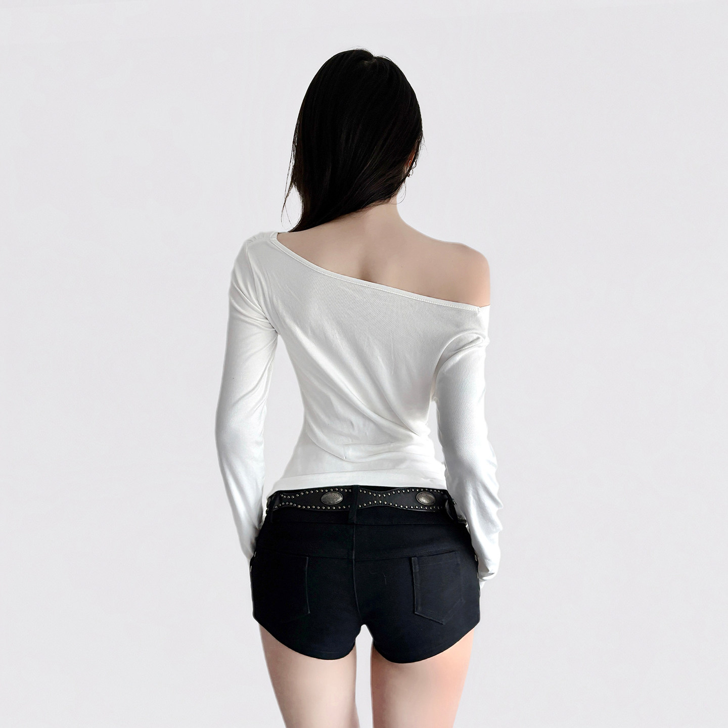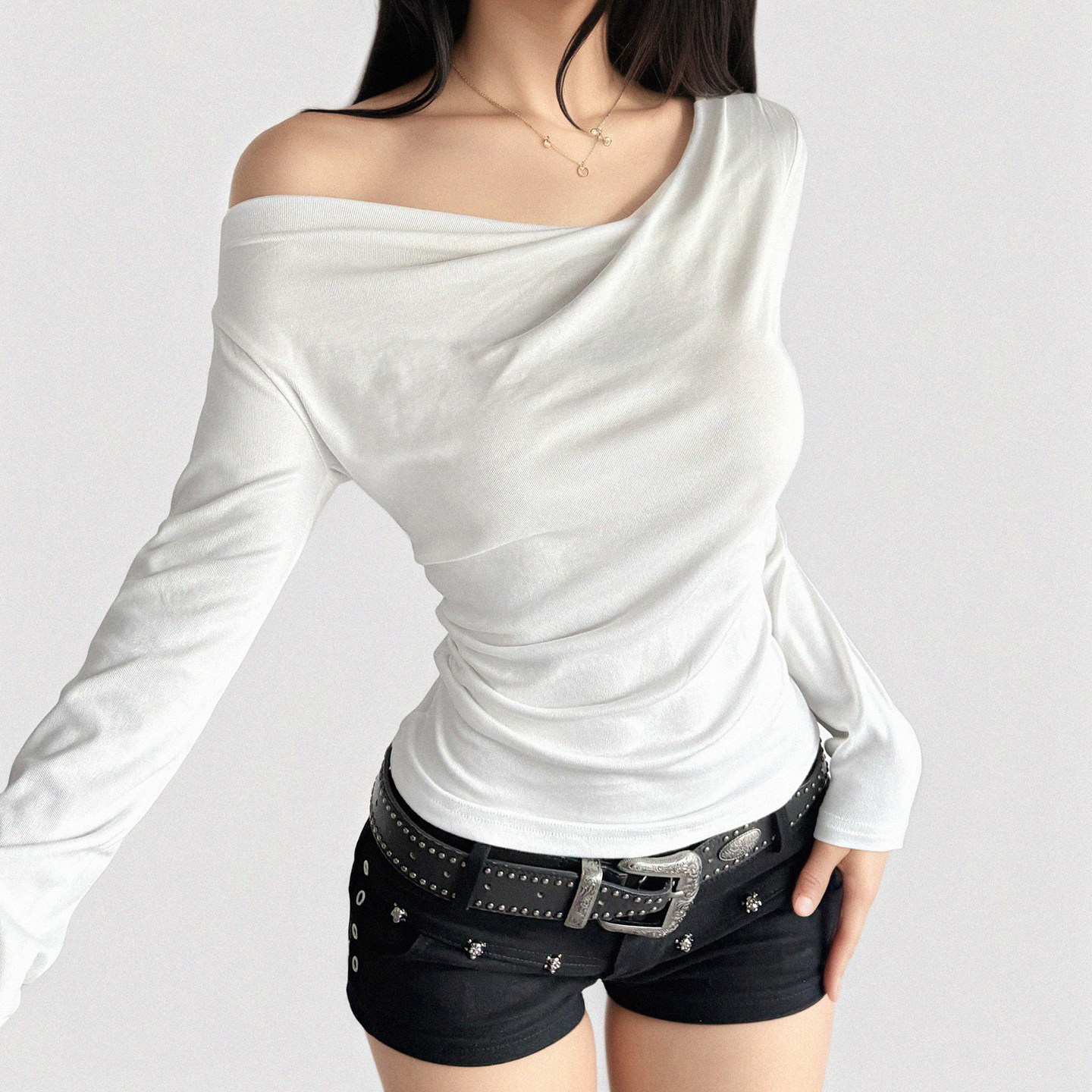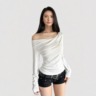 T恤秋不规则露肩收腰百搭上衣女 简约白色斜肩荡领长袖 FUNOFF 美式