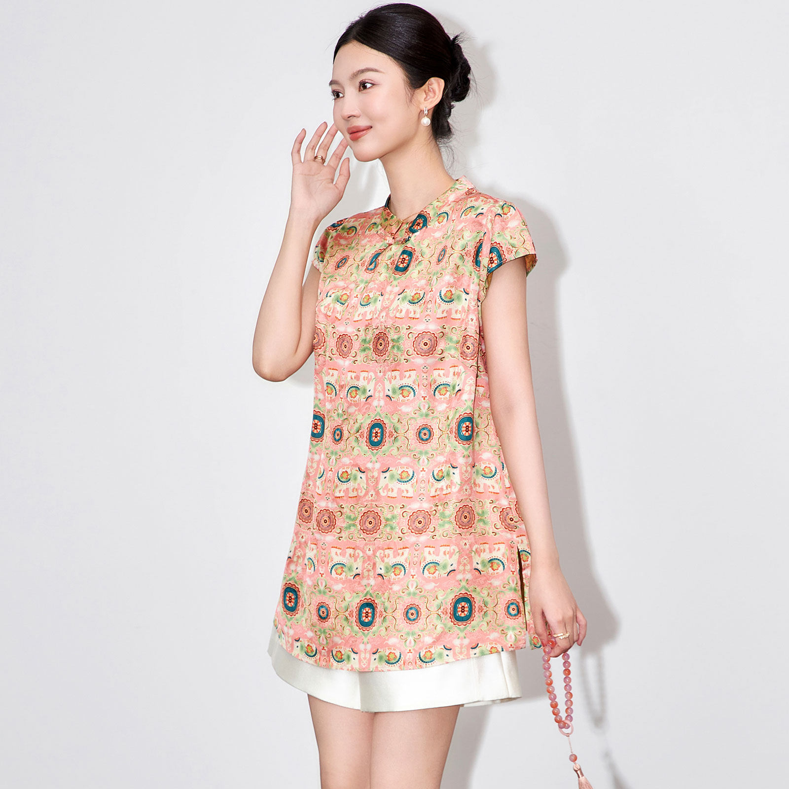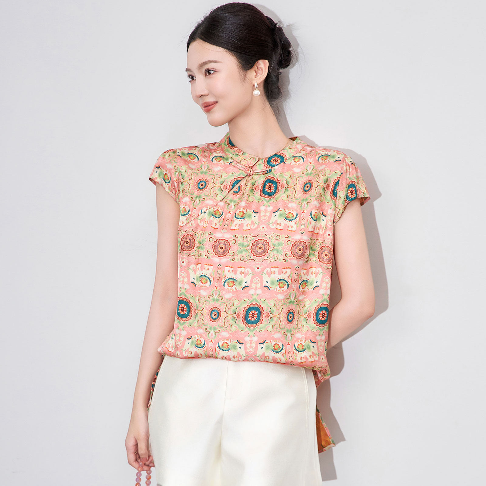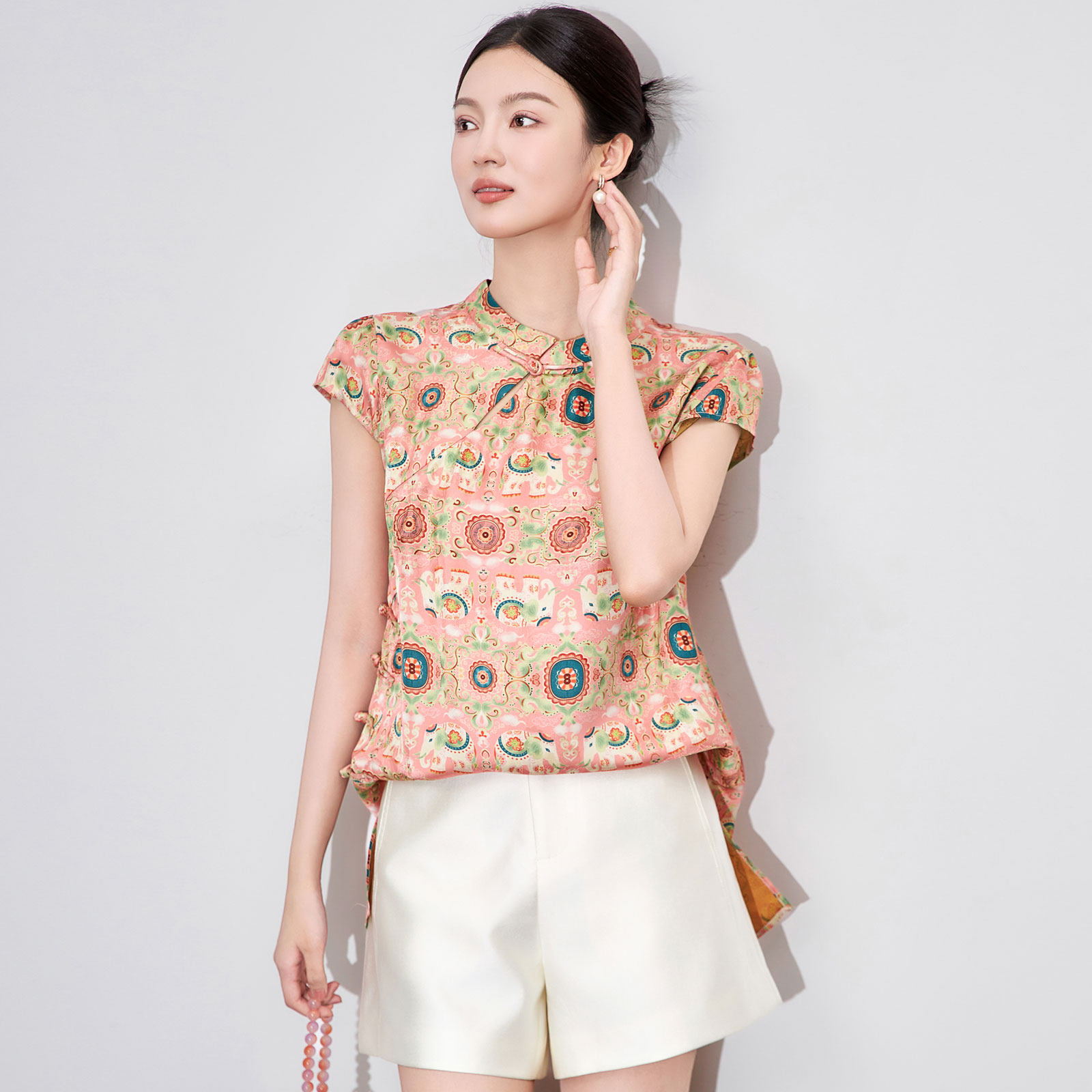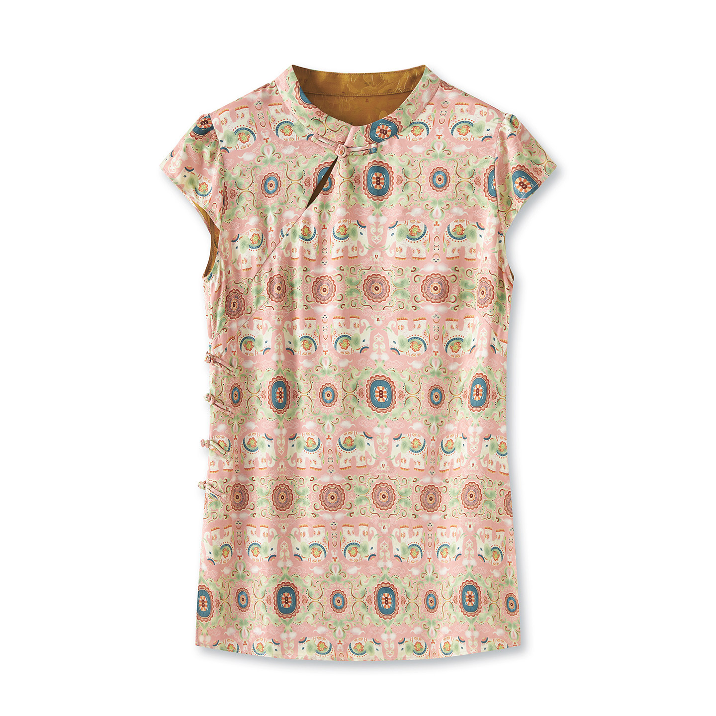 衬衫 复古小象提花短袖 旗袍领上衣 国风马甲T恤女25新款 迪奥新中式