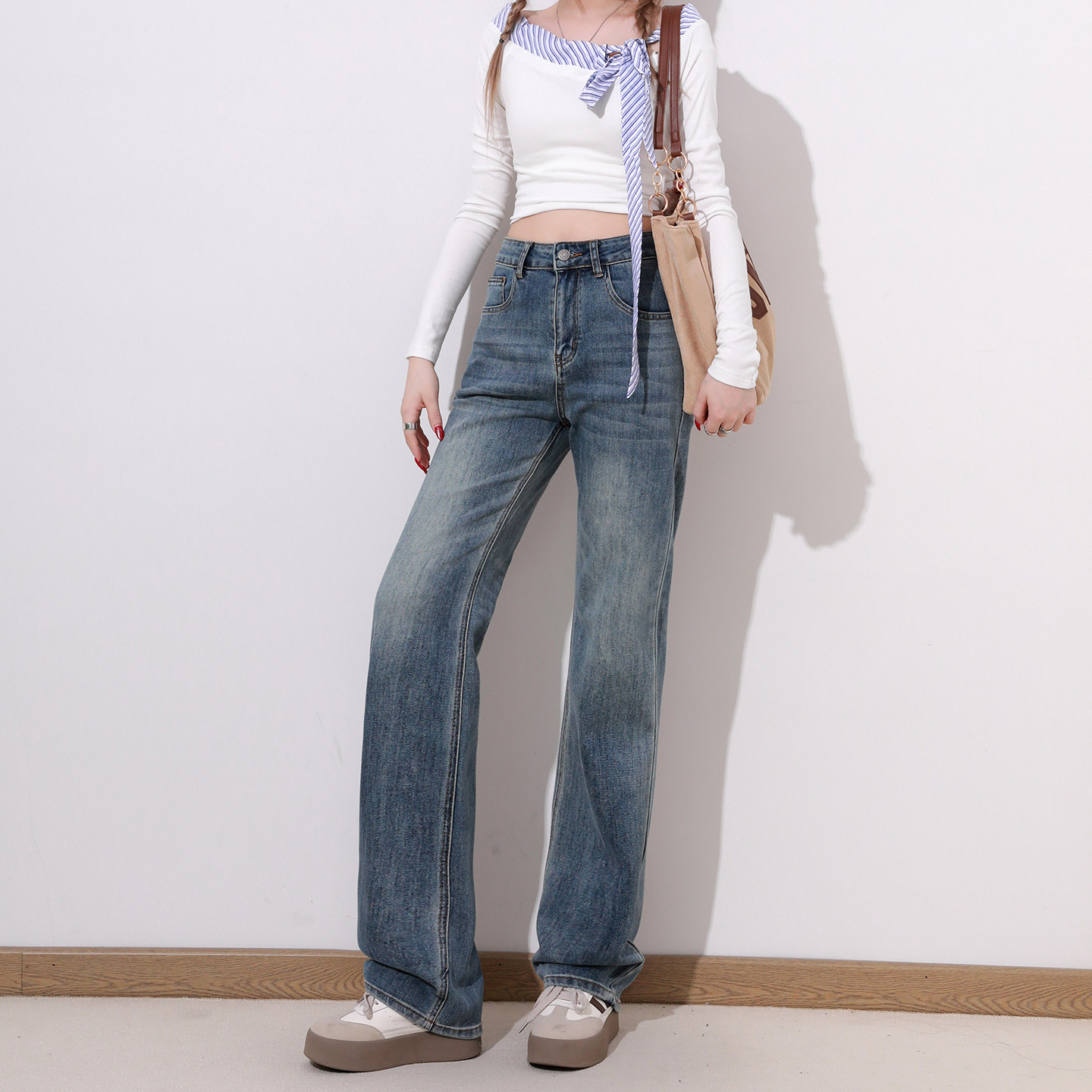 宽松显瘦高腰垂感百搭拖地裤 艾格窄版 新款 女春季 子 直筒蓝色牛仔裤