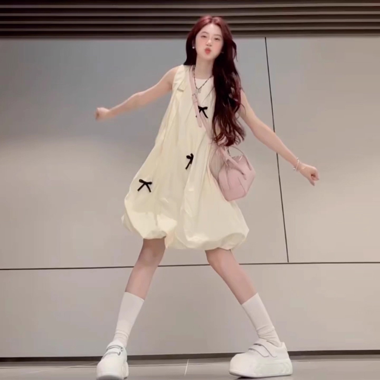 2025新款 花苞连衣裙子女夏季 小个子气质背心a字短裙 黄色无袖 法式