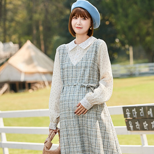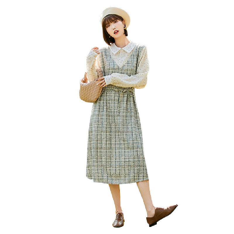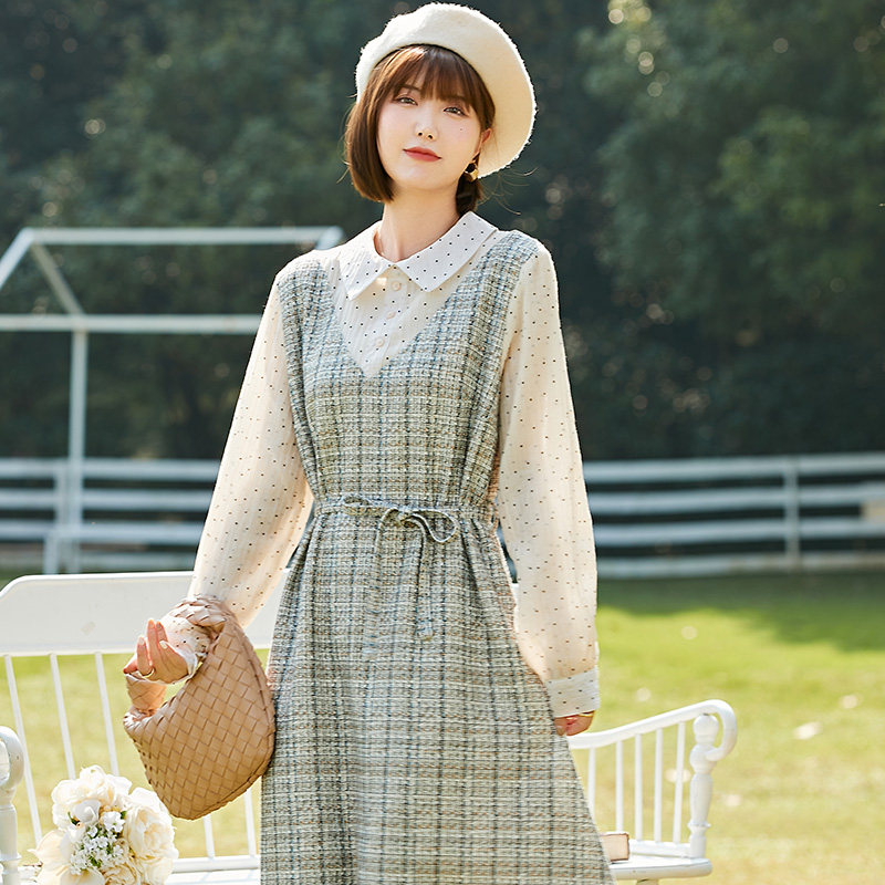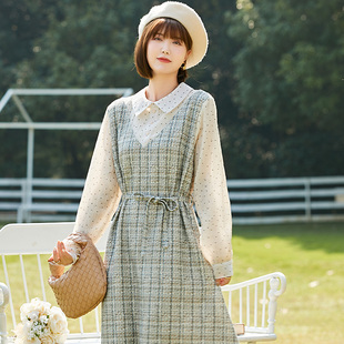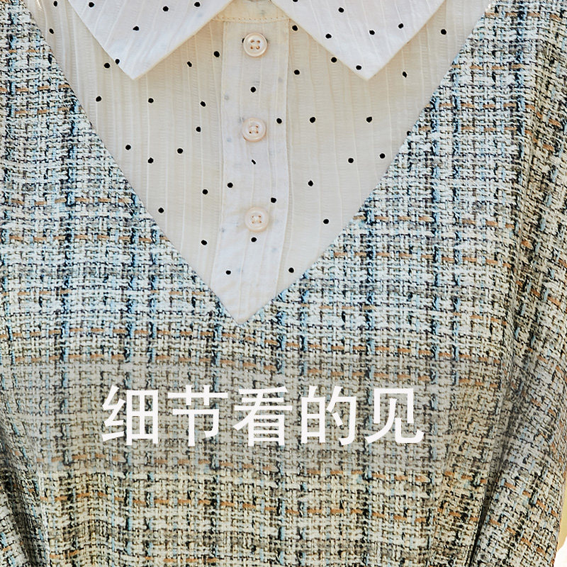 女格子短裙子 新款 阔色灰色假两件披肩长袖 连衣裙设计感2025秋冬季
