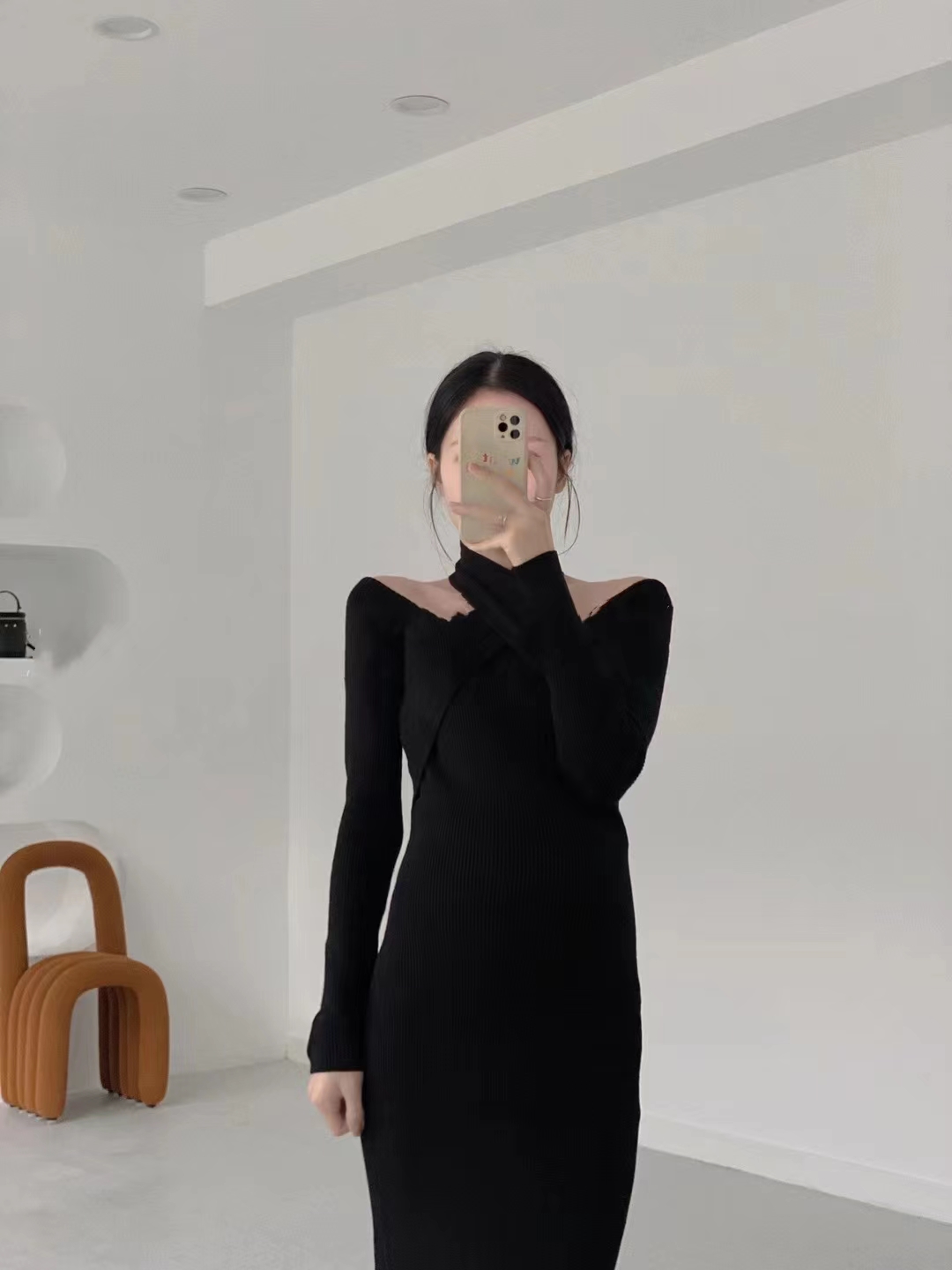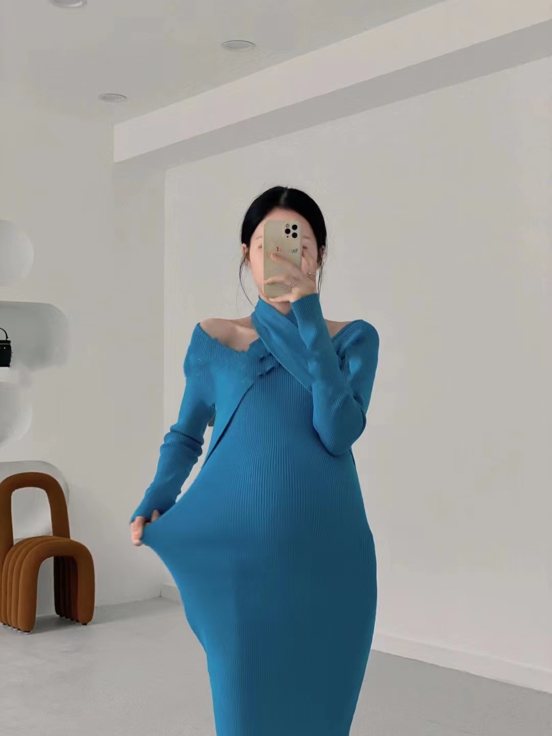 港味复古风交叉一字肩露肩修身 新款 显瘦开叉过膝连衣裙 春季 孕妇装