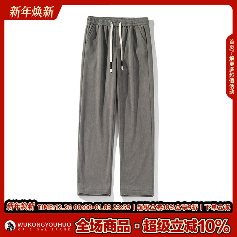 悟空有货秋冬潮牌简约纯色加绒运动卫裤 男复古街头宽松百搭休闲裤