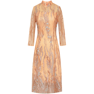 礼服连衣裙 橙色七分袖 粉蓝衣橱新中式 浮雕拼网纱蕾丝裙女2025秋装