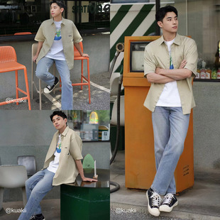 休闲直筒多口袋伐木工裤 复古做旧宽松米白牛仔裤 男秋 美式 马登工装
