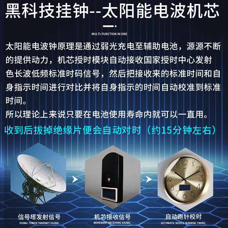 TQJ太阳能电波钟黄铜简约静音挂钟客厅家用时尚 挂表挂墙石英钟表