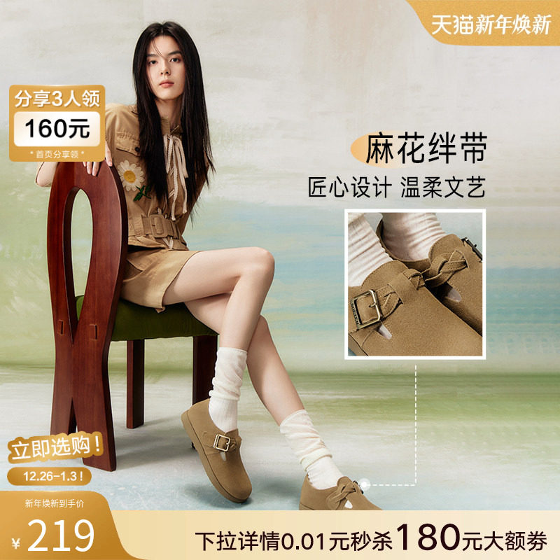 女单鞋 百思图2025春季 懒人鞋 复古休闲全包勃肯鞋 BG276AA5 商场新款