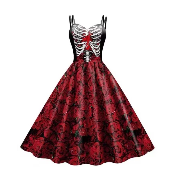 欧洲速卖通时尚 A字大摆万圣节性感吊带连衣裙女 骷髅玫瑰印花修身
