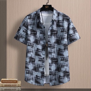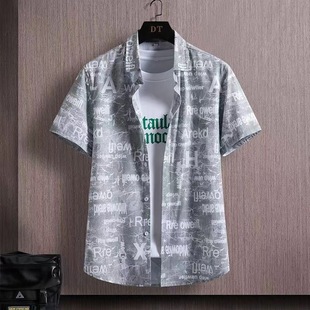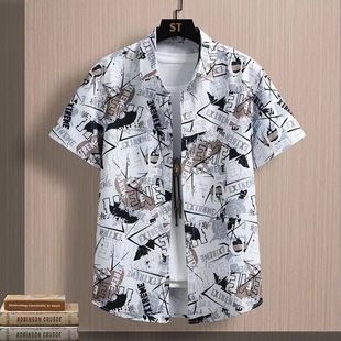 免烫高级感痞帅休闲寸衫 男士 衬衣冰丝潮牌涂鸦印花衬衫 短袖 薄 夏装