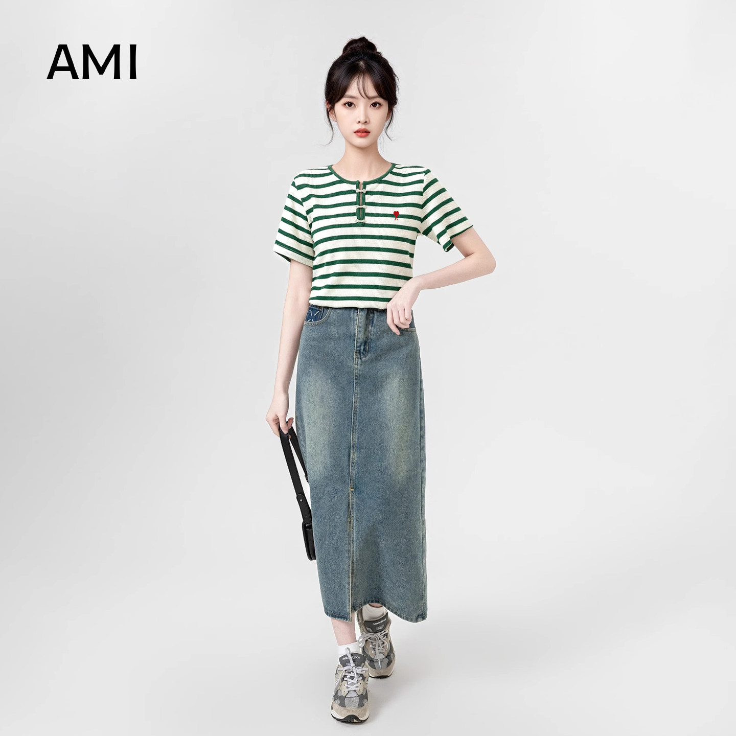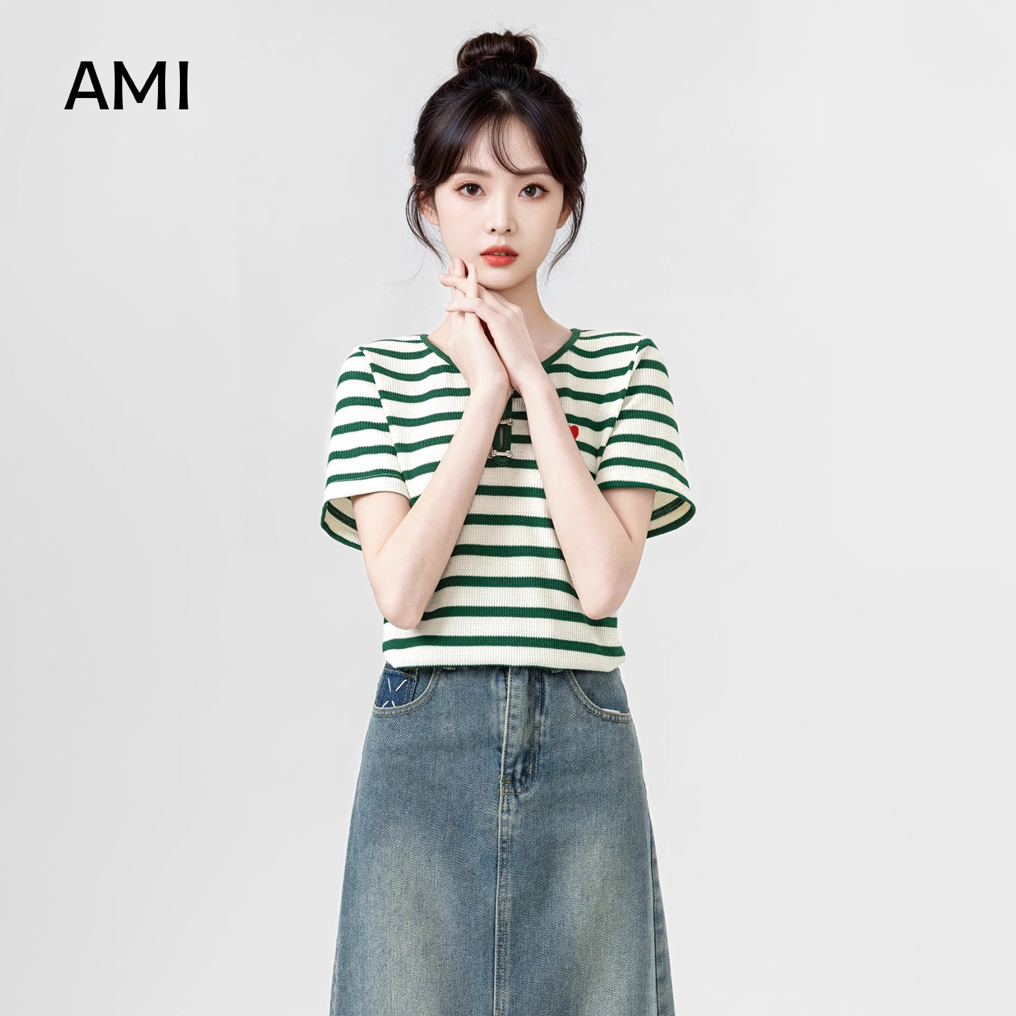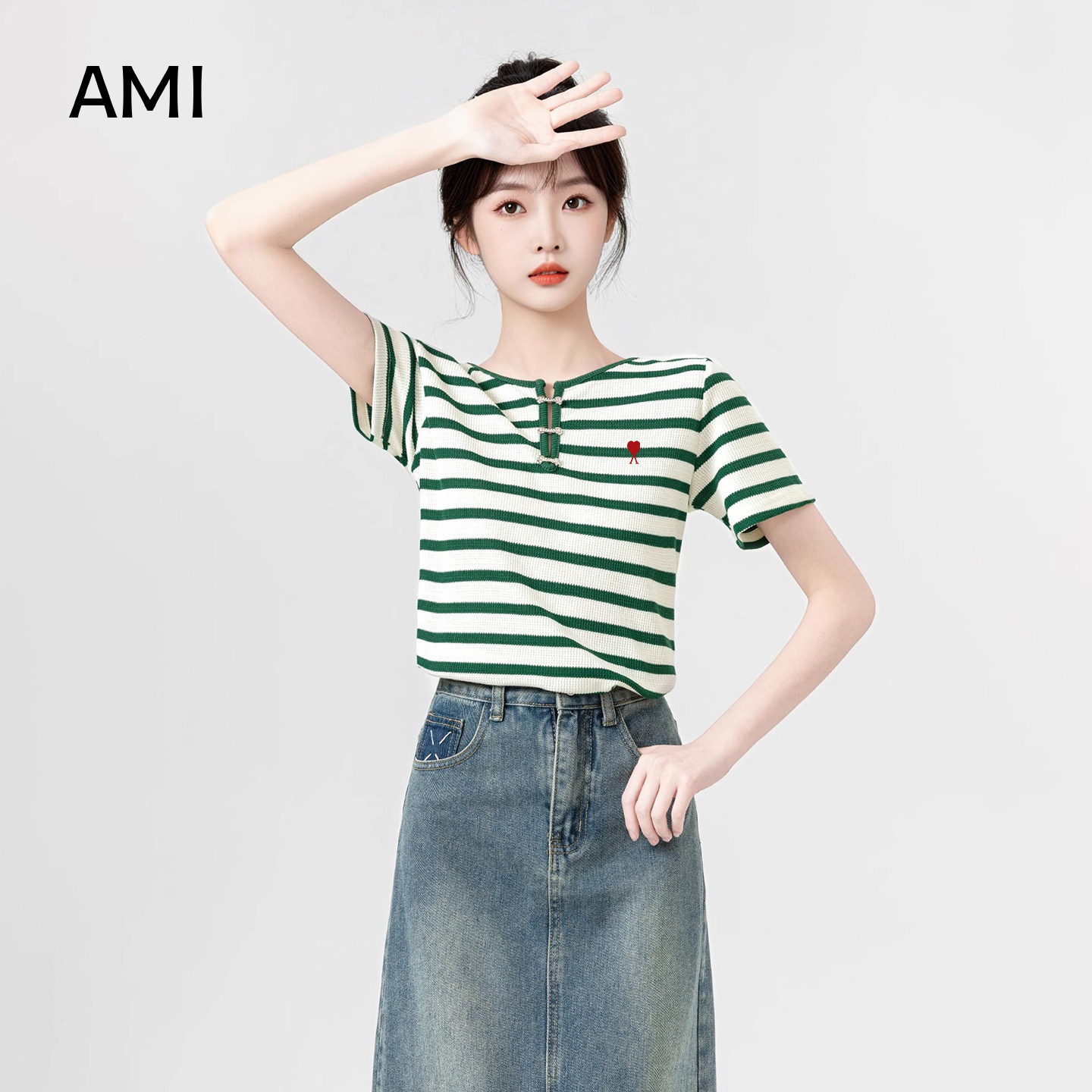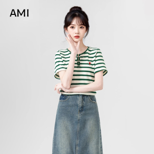 2026美式 设计感宽松26衫 绿色条纹短袖 正品 T恤女春新款 AMI官方