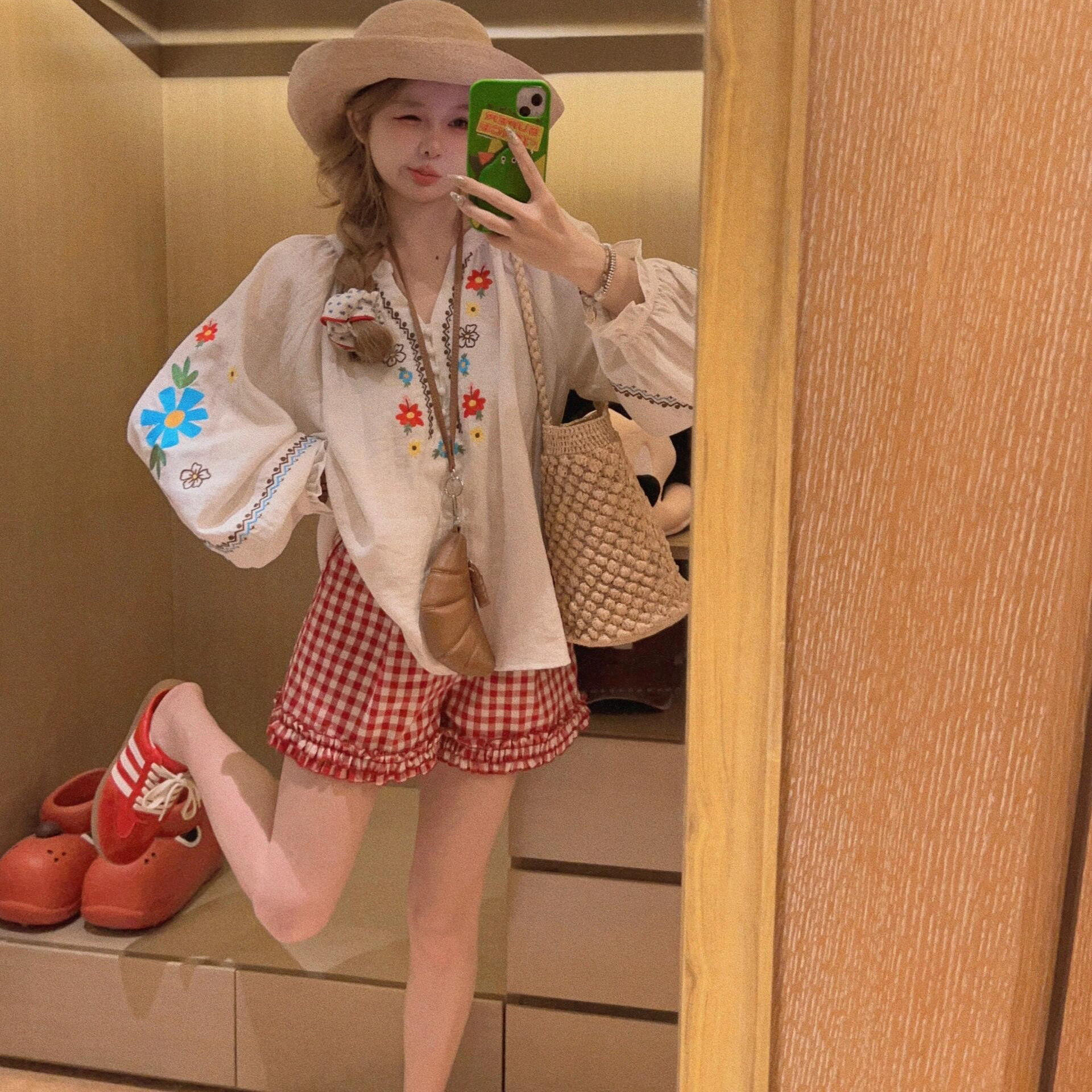 欢简韵韩系超仙正肩刺绣衬衫 宽松休闲套头百搭防晒衬衣 女春夏新款