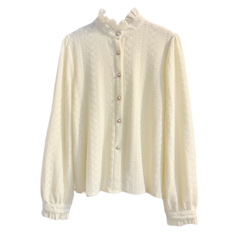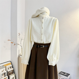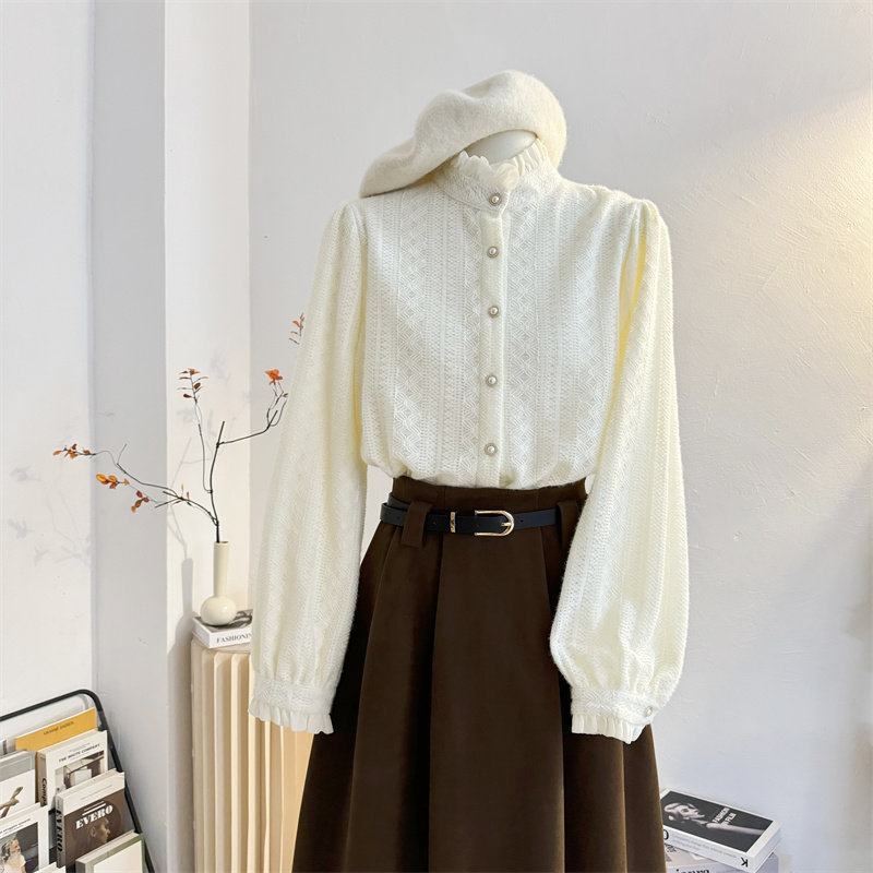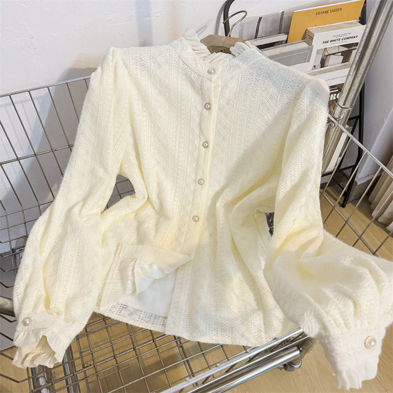 气质内搭打底小衫 女秋冬法式 上衣 加绒加厚衬衫 木耳花边立领蕾丝衫