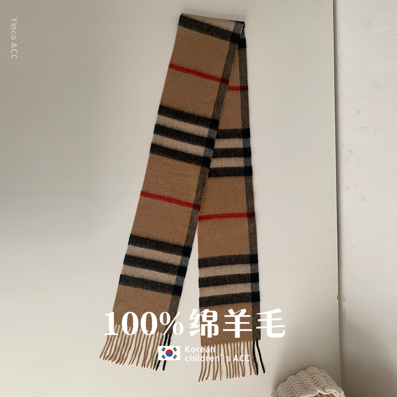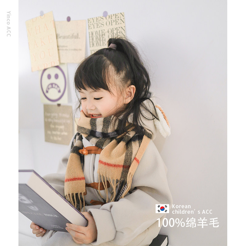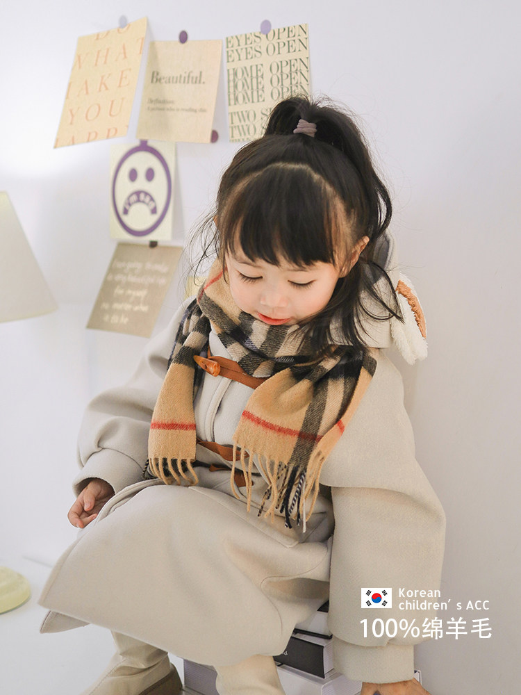 儿童羊毛围巾驼色复古英伦格子男女童宝宝秋冬季 百搭 保暖围脖韩版