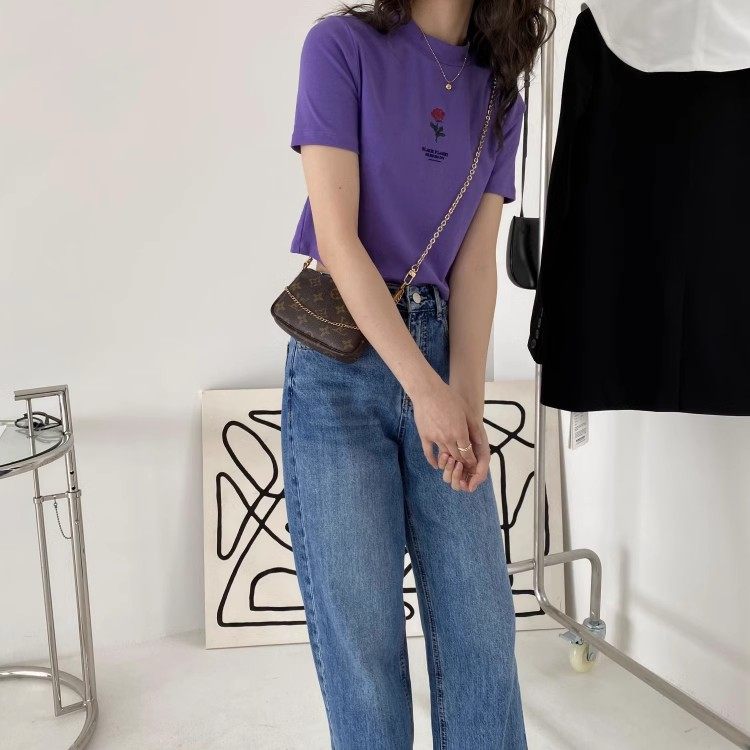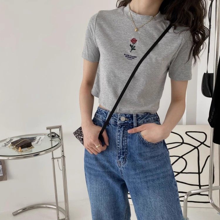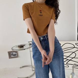 包邮 T恤叠穿上衣 34880 精致刺绣花朵短袖 0.11KG 辣妹风高腰短款