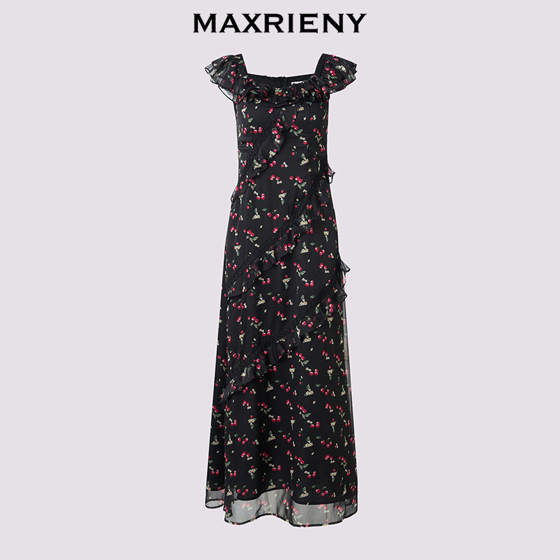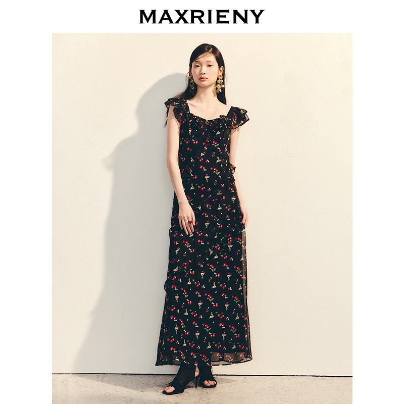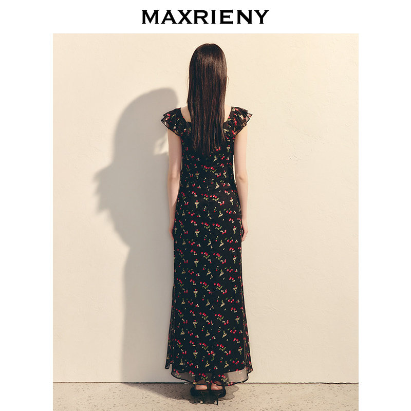 法式 新款 度假雪纺气质长裙 25夏季 MAXRIENY樱桃印花收腰连衣裙长款