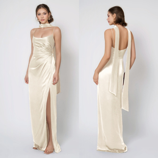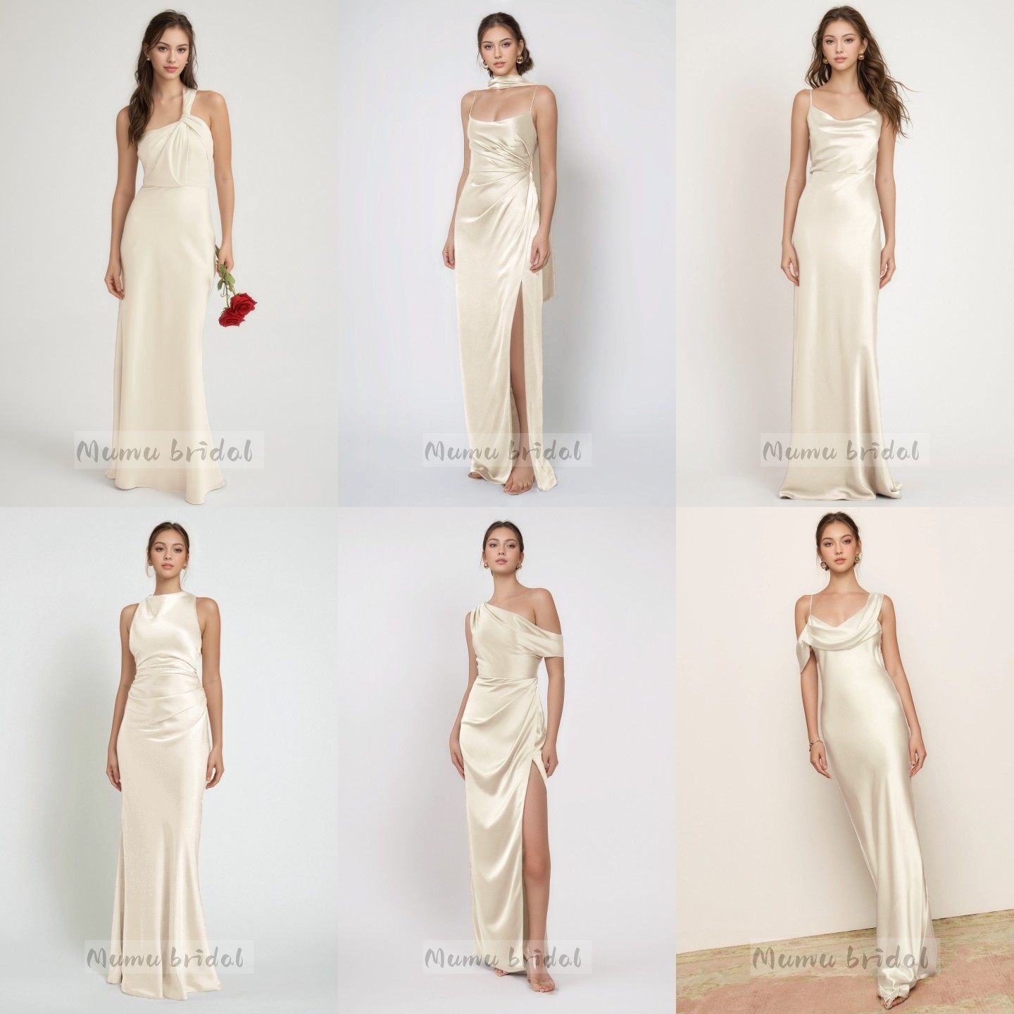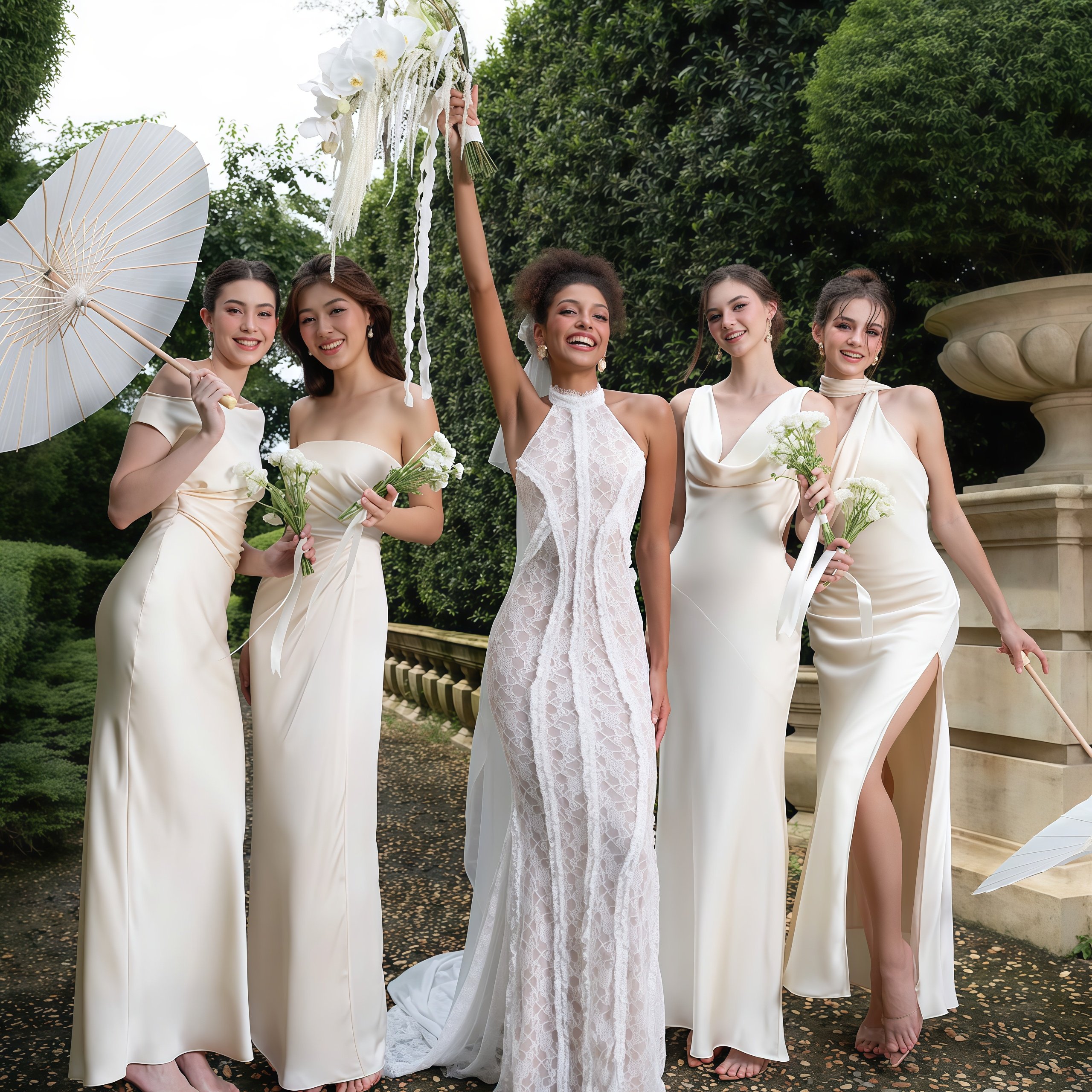 浅香槟色缎面伴娘服姐妹团礼服伴娘裙高级小众婚礼姐妹服伴娘团