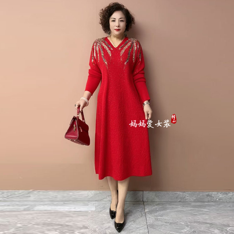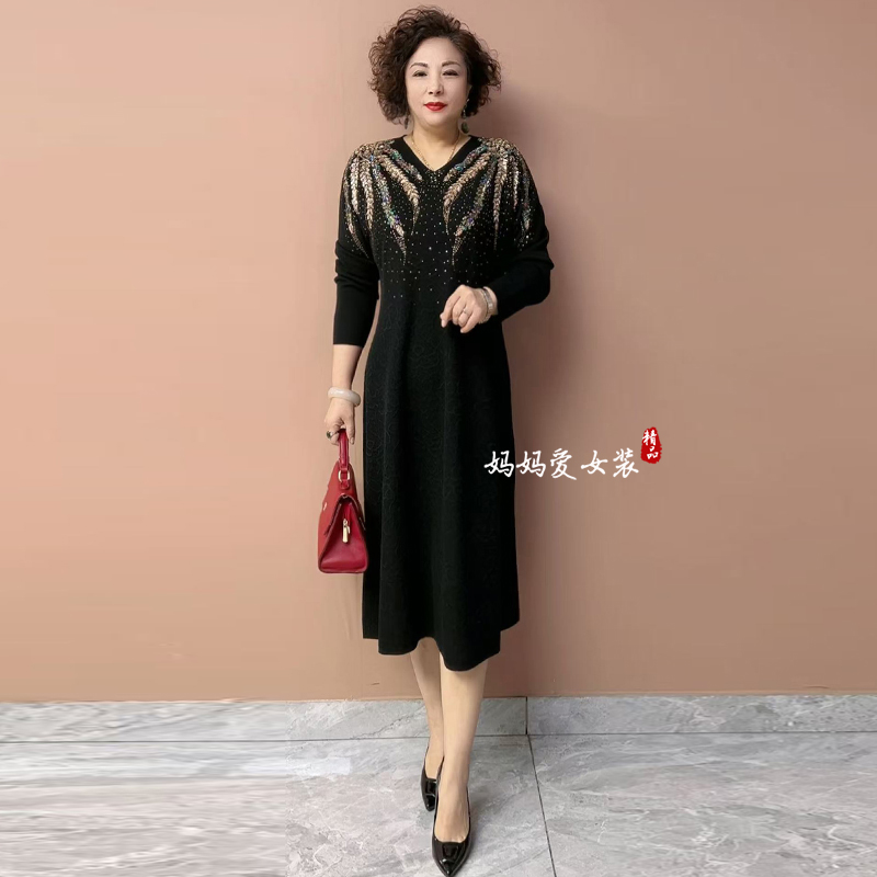精致镶钻V领气质修身 连衣裙春秋减龄喜婆婆针织裙长裙子 显瘦大码